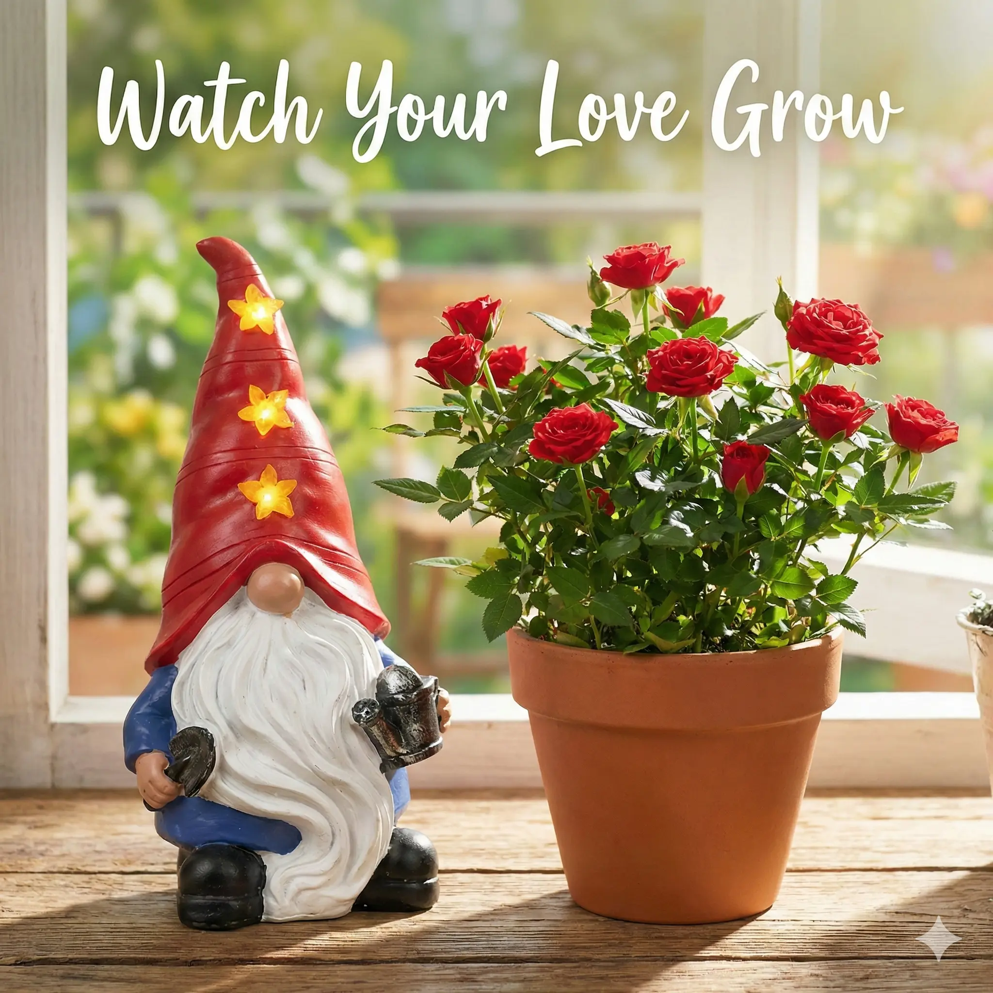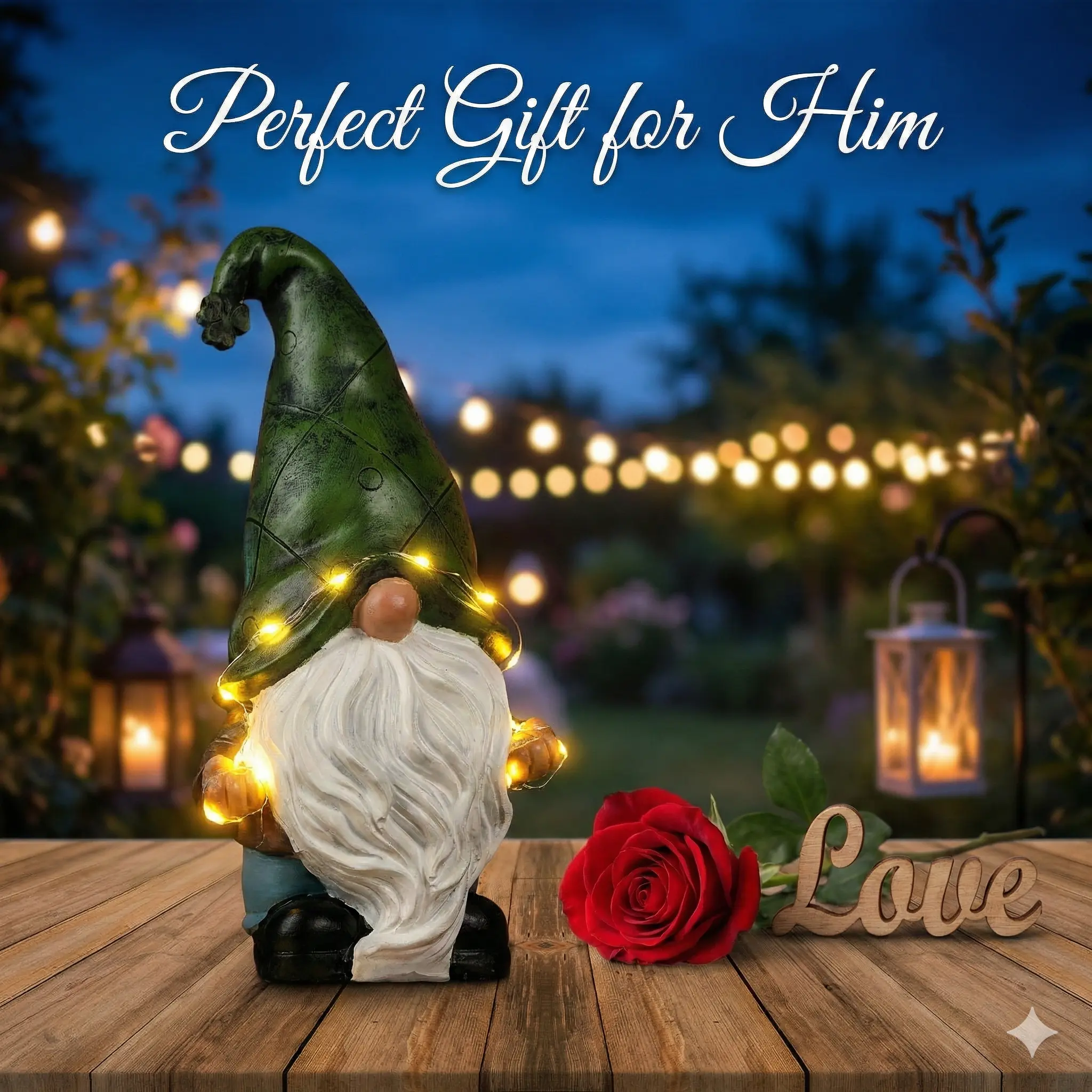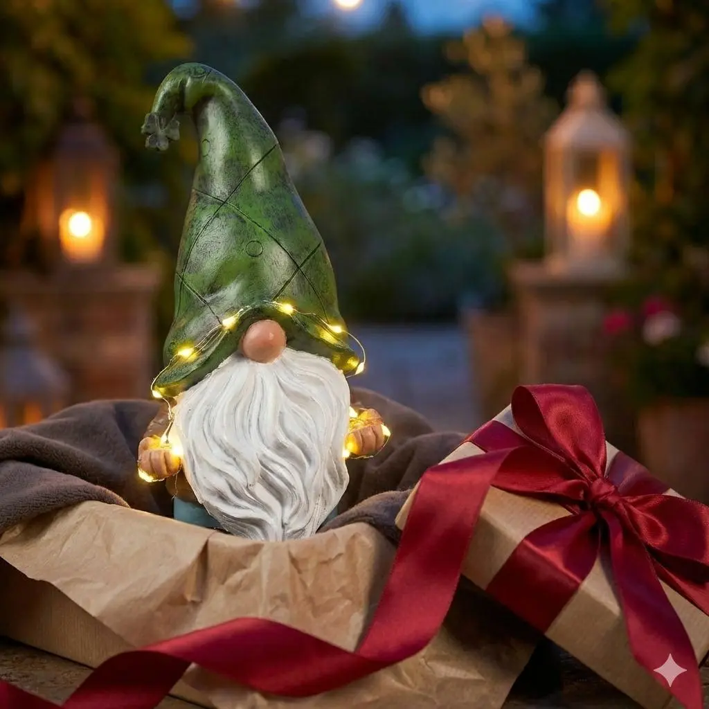 The stars of the set are our solar-powered resin gnomes: Handcrafted from premium weather-resistant resin, these two adorable gnomes bring whimsical, rustic charm to any space. The green-hat gnome glows with warm LED fairy lights at night, while the red-hat gnome holds a cute watering can. Built-in solar panels charge during the day, so they light up automatically at dusk—no batteries, no wires, just effortless cozy magic!