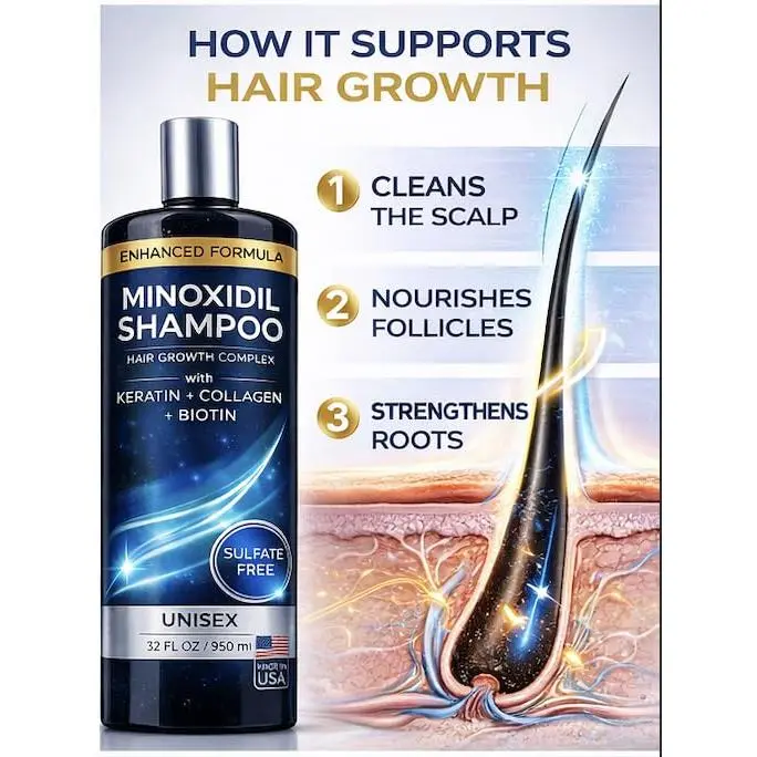 ·Minoxidil Hair Growth Shampoo is formulated to help support healthier-looking hair while nourishing the scalp. This advanced hair care formula combines Minoxidil with a powerful blend of botanical extracts including Saw Palmetto, Rosemary Oil, and Bergamot. These ingredients work together to help improve the appearance of thicker, fuller hair while helping maintain a balanced scalp environment. Enriched with Keratin, Argan Oil, and Biotin, this shampoo helps strengthen hair strands and reduce breakage, making hair feel smoother and more manageable. Perfect for men and women experiencing thinning hair, hair fall, or weak hair strands, this formula gently cleanses the scalp while delivering essential nutrients to support healthier-looking hair. Suitable for all hair types and ideal for daily use.