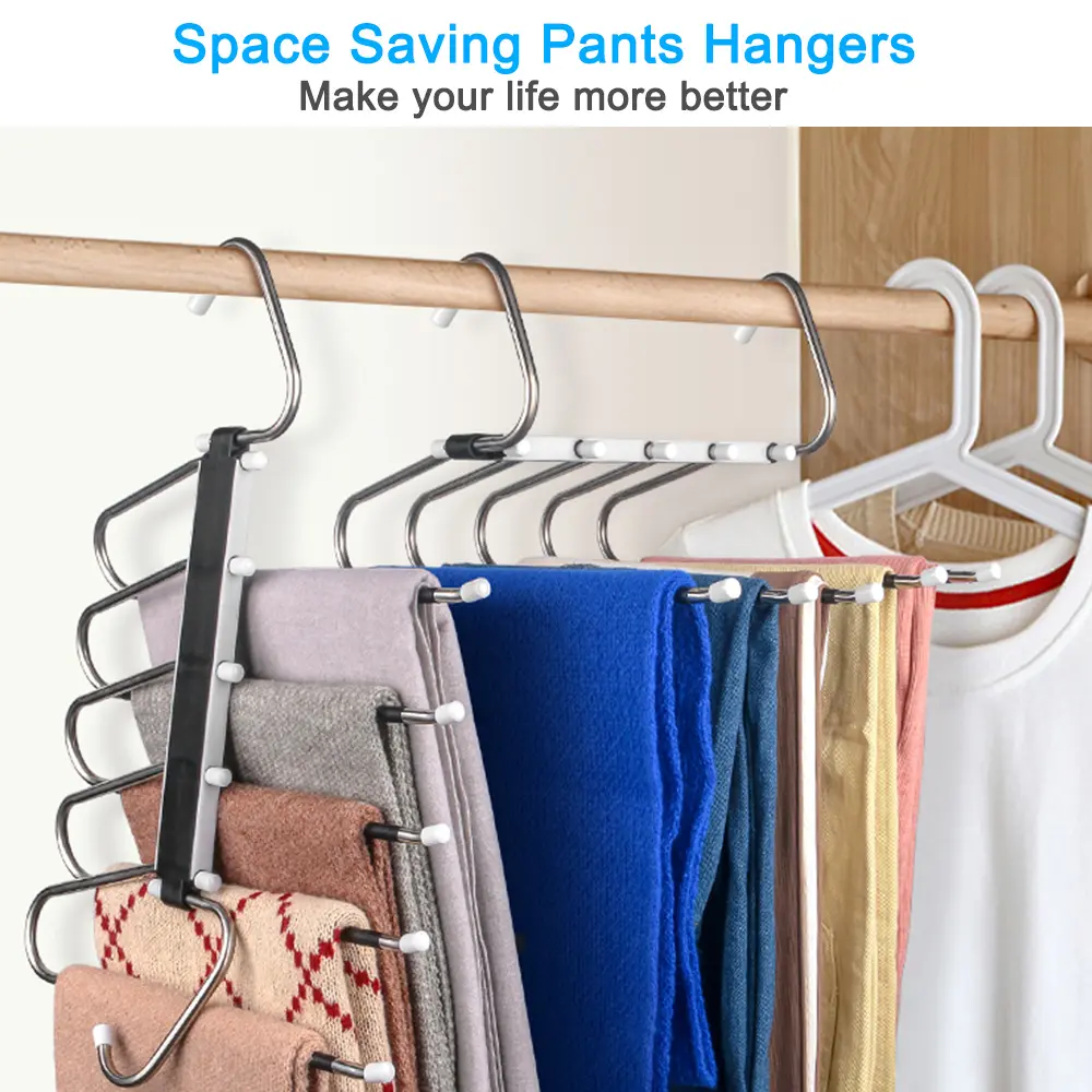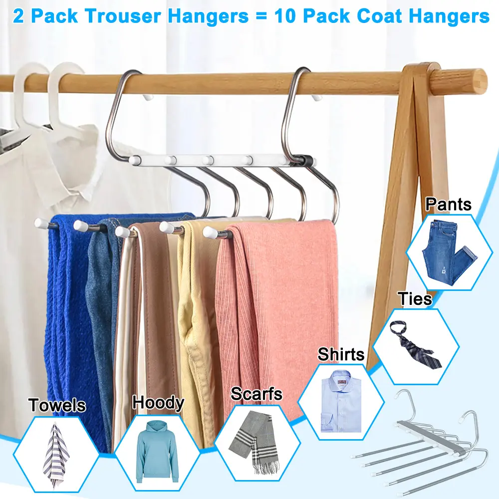 Our 2 pack 5-in-1 space saving pant hangers is a great alternative to 10 pack bulky clothes hangers plastic or metal hangers.The horizontal use of the magic hangers makes it easy to access clothes, and vertical use can save 80% of closet space.
