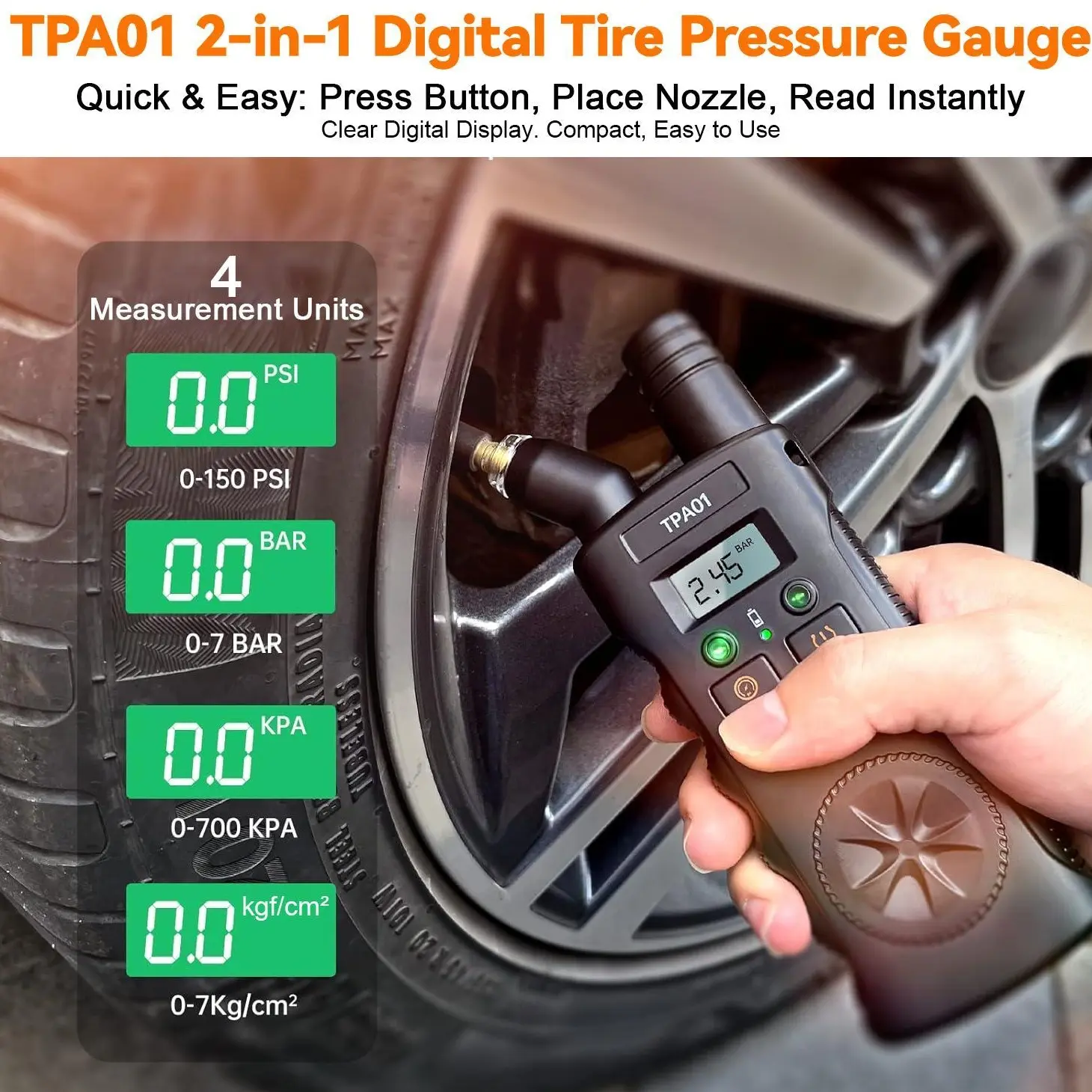 ·High-Accuracy Gauge: Clear backlit LCD displays readings in PSI, BAR, KPA, or kg/cm² (up to 150 PSI).