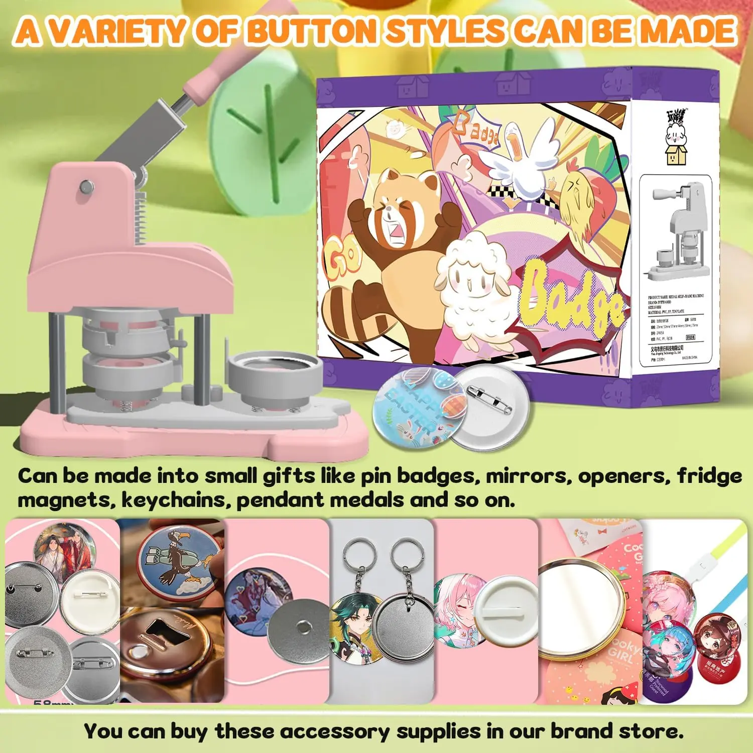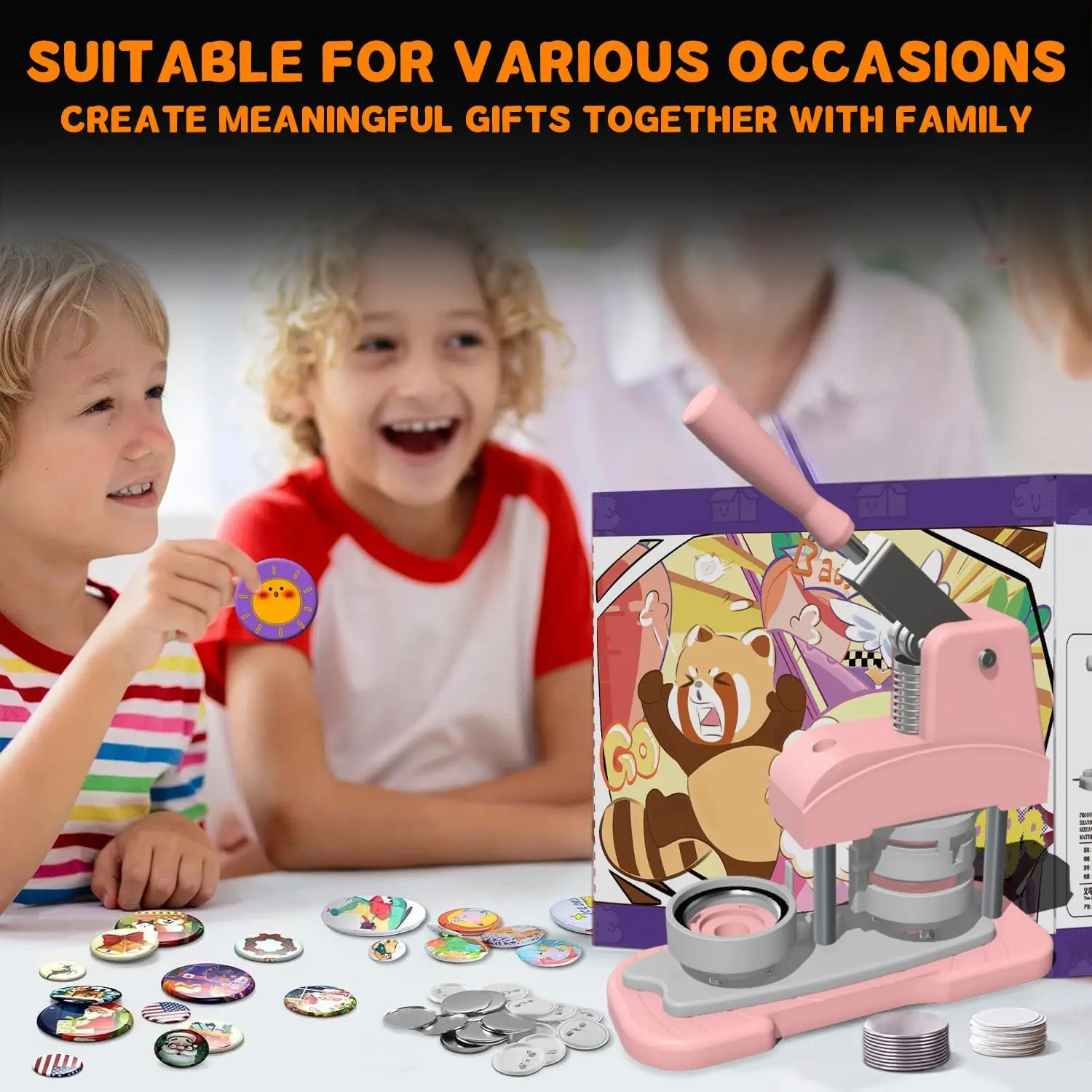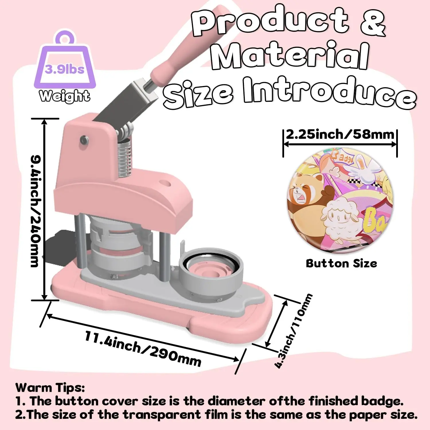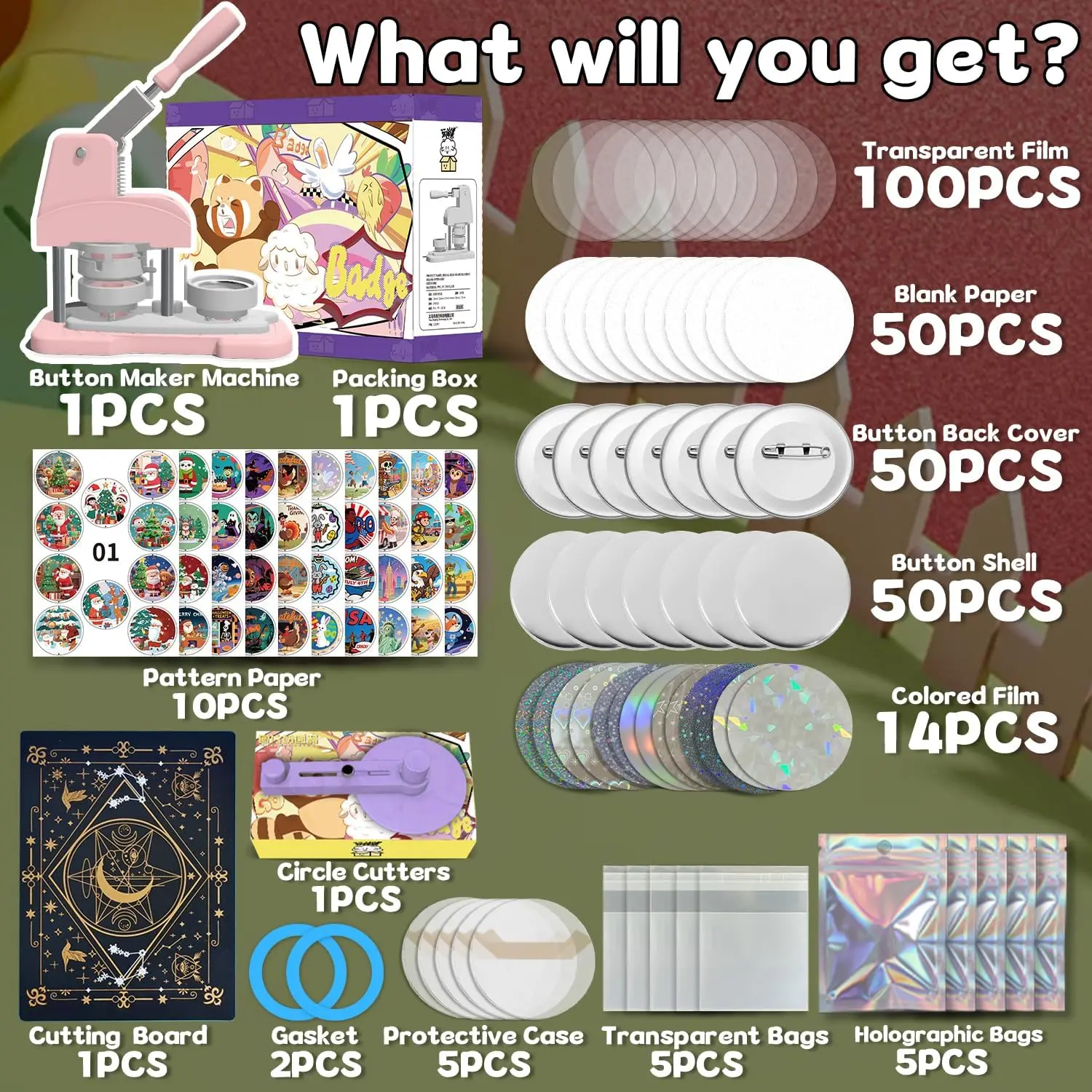 DIY Button Maker Machine Kit Includes: 58mm (2.25 inch) Badge Maker, Circle Cutters, 50pcs Button Parts, 50pcs Blank Paper, 100pcs Transparent Film, 14pcs Colored Film, 10pcs Pattern Paper, 1pcs Cutting Board, 2pcs Gasket, 5pcs Protective Case, 5pcs Transparent Bags, 5pcs Holographic Bags.With its beautiful packaging, this button machine can be given as a gift for kids and DIY enthusiasts.Multiple Functions: This DIY badge making machine offers versatile uses, allowing you to create small gifts like pin badges, mirrors, openers, fridge magnets, keychains, pendant medals and so on.New Design: This machine adopts high-strength engineering plastics, with its handle reinforced by stainless steel for enhanced pressure resistance.Its body and button mold are integrated, featuring light weight, a long lifespan, and easy operation.Additionally, the handle is scientifically calibrated to help you find the optimal pressure, significantly improving the stability and success rate of badge making.Wide Application:You can make various DIY badges: choose your favorite pictures to create custom designs, or make personalized badges.Use the button pin maker to design pins for decorating jackets, backpacks, or hats-perfect for DIY home projects or personalized gifts.The pin maker machine is widely used for school activities, children's birthdays, opening ceremonies, business activities, Thanksgiving, holiday gifts, souvenirs, etc.Easy Handling:First, cut pictures to the proper size with the simple, easy-to-use circle cutter punch press.Second, set the 58mm badge bottom and top moulds on the button machine.Third, place the badge metal cover into the top cover mould and the picture on the cover.Fourth, place the transparent film on the picture and press down the badge making machine handle.Last, add the metal pin backing to the bottom cover mould and press the handle again.