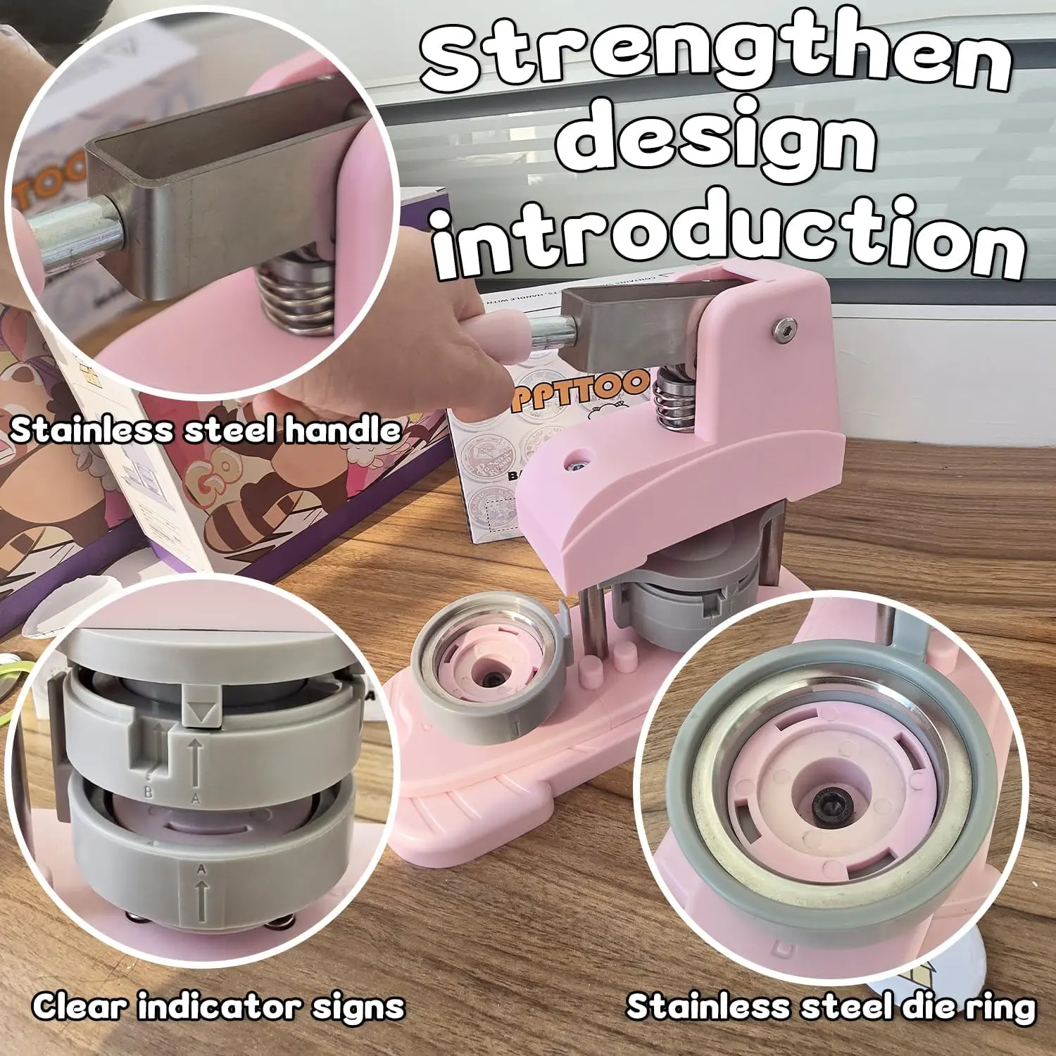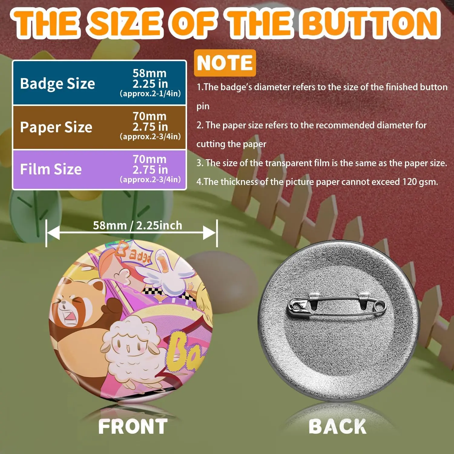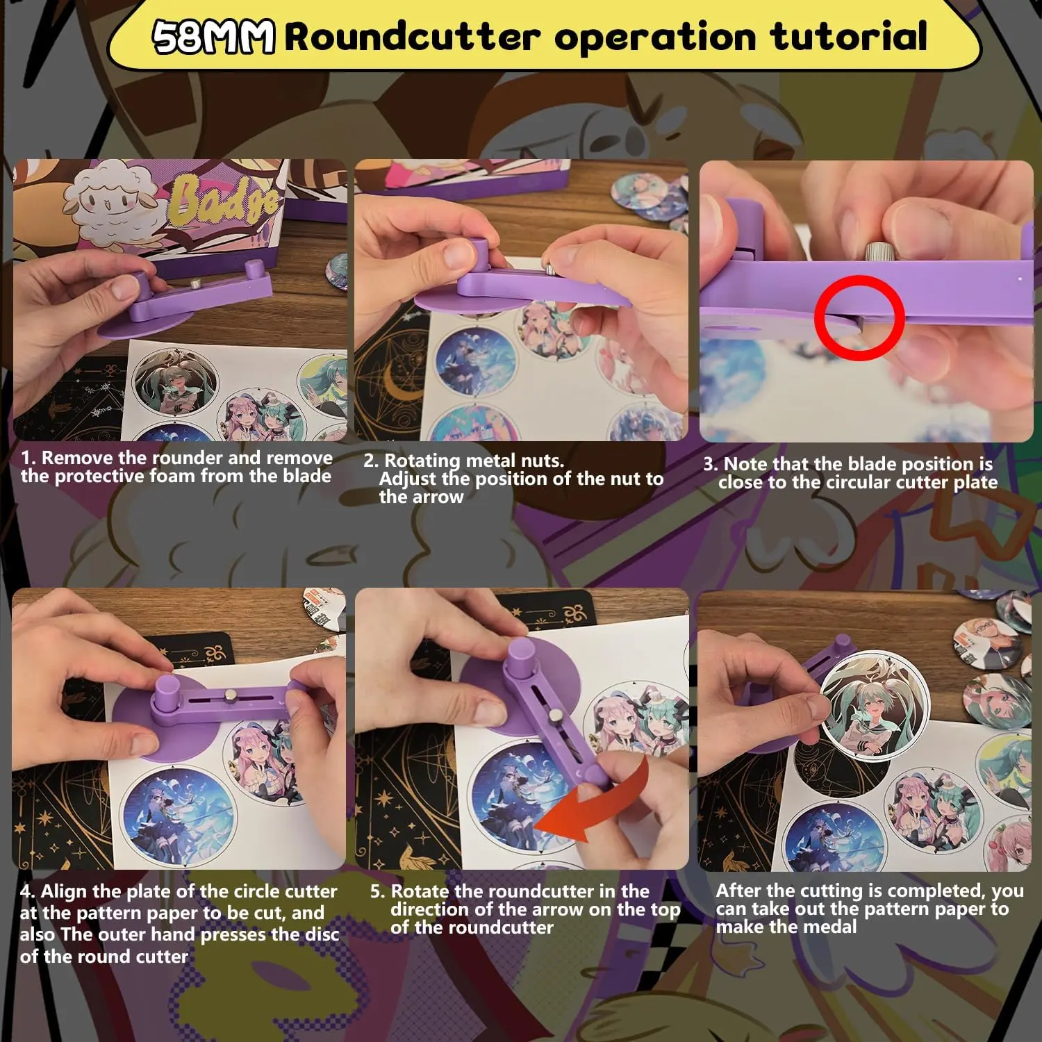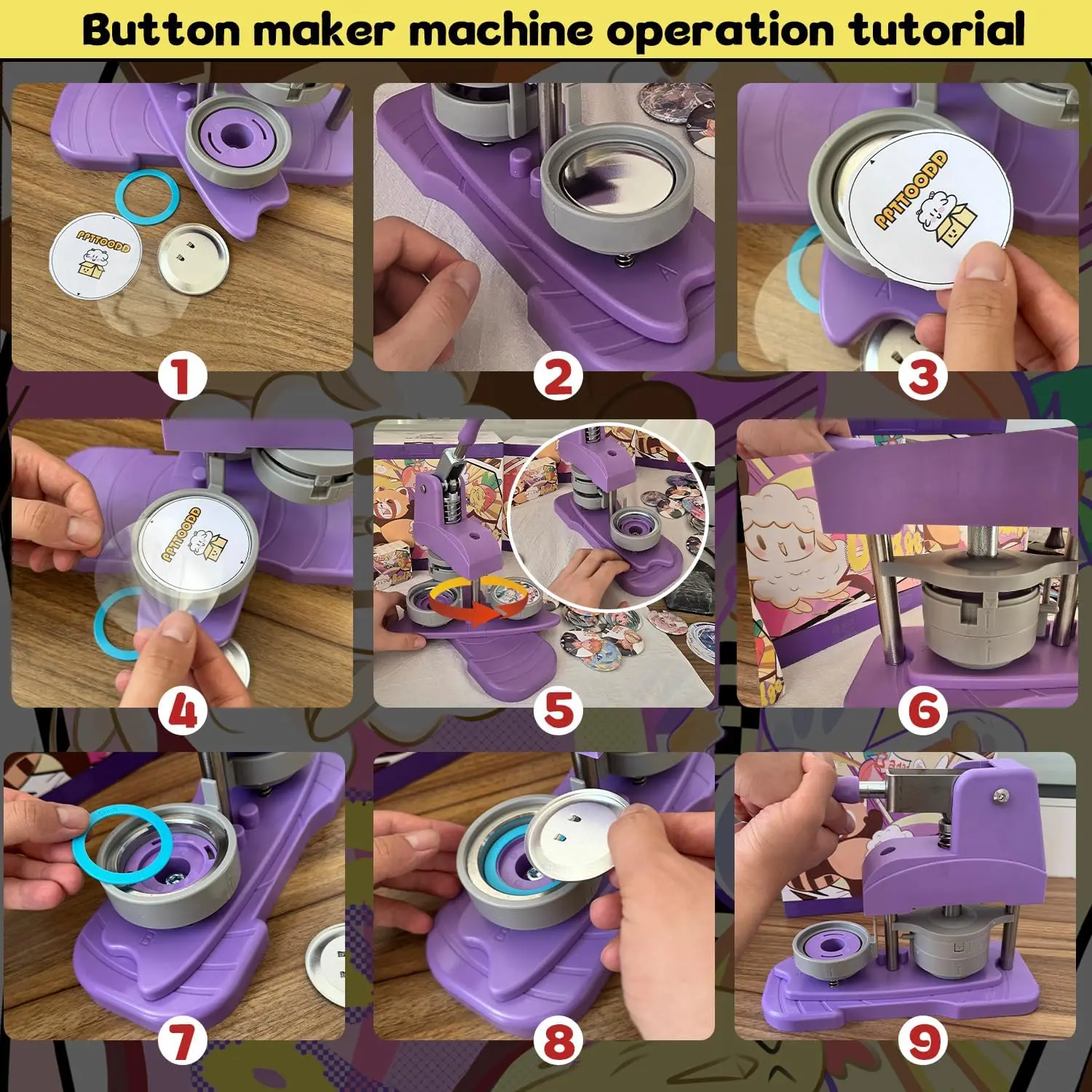 DIY Button Maker Machine Kit Includes: 58mm (2.25 inch) Badge Maker, Circle Cutters, 50pcs Button Parts, 50pcs Blank Paper, 100pcs Transparent Film, 14pcs Colored Film, 10pcs Pattern Paper, 1pcs Cutting Board, 2pcs Gasket, 5pcs Protective Case, 5pcs Transparent Bags, 5pcs Holographic Bags.With its beautiful packaging, this button machine can be given as a gift for kids and DIY enthusiasts.Multiple Functions: This DIY badge making machine offers versatile uses, allowing you to create small gifts like pin badges, mirrors, openers, fridge magnets, keychains, pendant medals and so on.New Design: This machine adopts high-strength engineering plastics, with its handle reinforced by stainless steel for enhanced pressure resistance.Its body and button mold are integrated, featuring light weight, a long lifespan, and easy operation.Additionally, the handle is scientifically calibrated to help you find the optimal pressure, significantly improving the stability and success rate of badge making.Wide Application:You can make various DIY badges: choose your favorite pictures to create custom designs, or make personalized badges.Use the button pin maker to design pins for decorating jackets, backpacks, or hats-perfect for DIY home projects or personalized gifts.The pin maker machine is widely used for school activities, children's birthdays, opening ceremonies, business activities, Thanksgiving, holiday gifts, souvenirs, etc.Easy Handling:First, cut pictures to the proper size with the simple, easy-to-use circle cutter punch press.Second, set the 58mm badge bottom and top moulds on the button machine.Third, place the badge metal cover into the top cover mould and the picture on the cover.Fourth, place the transparent film on the picture and press down the badge making machine handle.Last, add the metal pin backing to the bottom cover mould and press the handle again.