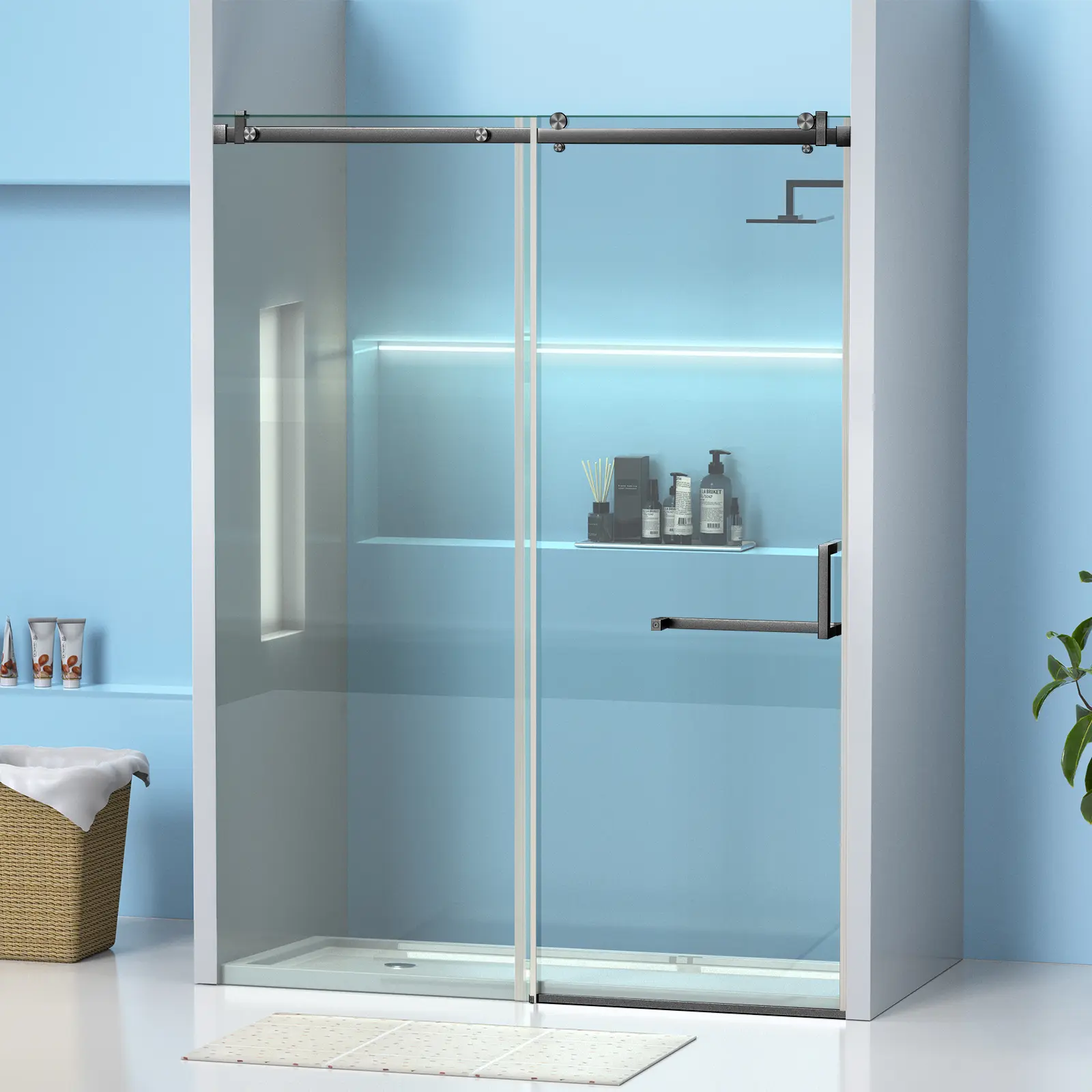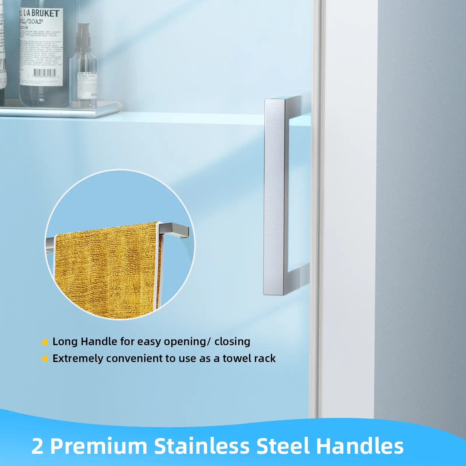 ·Morden Shower Door: Our frameless shower door measures 56-60" W × 75" H and features a contemporary, minimalist design that brings a sleek and elegant touch to your space. Additionally, the sliding door is equipped with two brushed stainless steel handles, enhancing both its visual appeal and tactile experience.