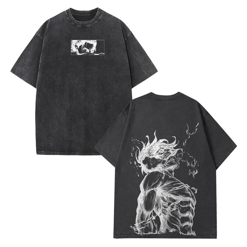 Eren Yeager Attack on Titan Graphic Tee – Shiffer Titan Double-Sided Oversized Anime Shirt, Acid-Washed Cotton Unisex Top, Trendy Streetwear Menswear for Casual, Party, Convention, and AOT Fans
