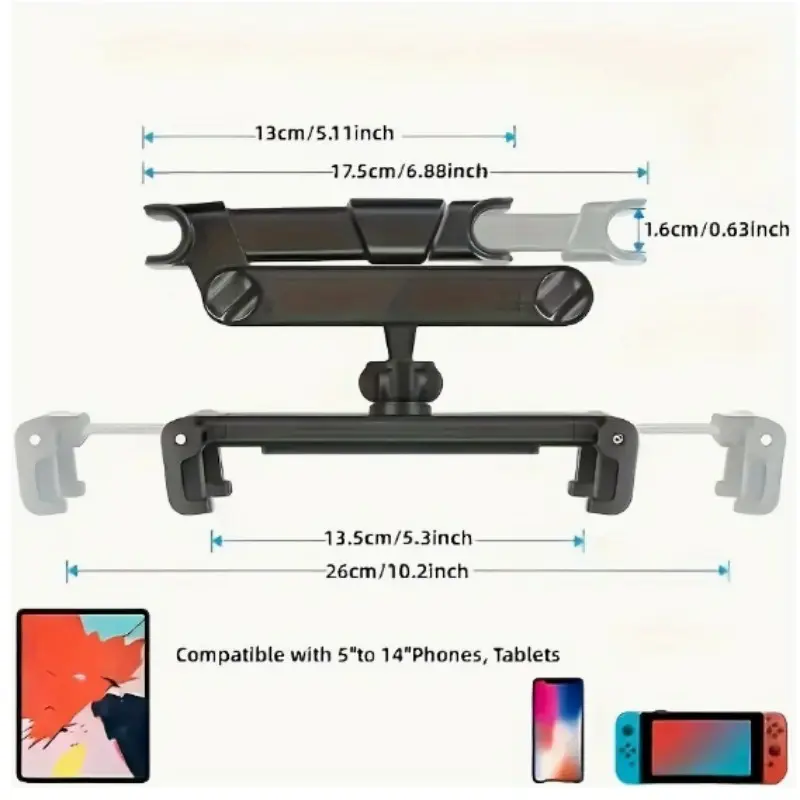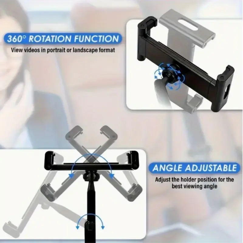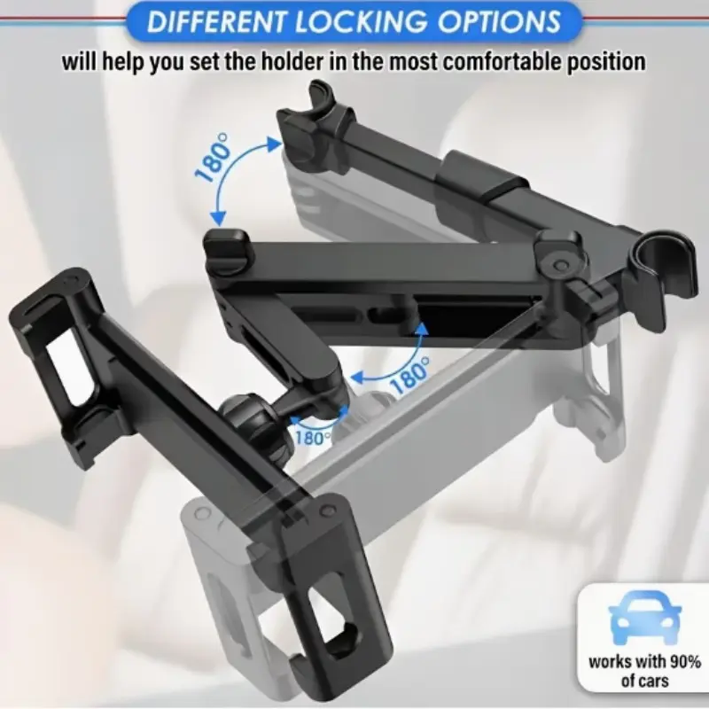 The main body of the stand is crafted from high-strength ABS material and anti-slip silicone pads, ensuring a sturdy and durable structure. The silicone pads at the clamping area effectively absorb shocks, preventing the device from slipping and getting scratched. With its innovative folding and rotating design, it supports 360° rotational adjustment and multi-angle tilt positioning. Passengers can freely adjust the viewing angle according to their seating posture, balancing comfort and convenience. The installation method is simple and convenient, requiring no drilling or pasting. It can be directly fastened to the headrest pillar of the seat with buckles, adapting to headrest bars of different thicknesses. After installation, it remains stable and does not wobble, ensuring a bumpless ride even during rough driving.