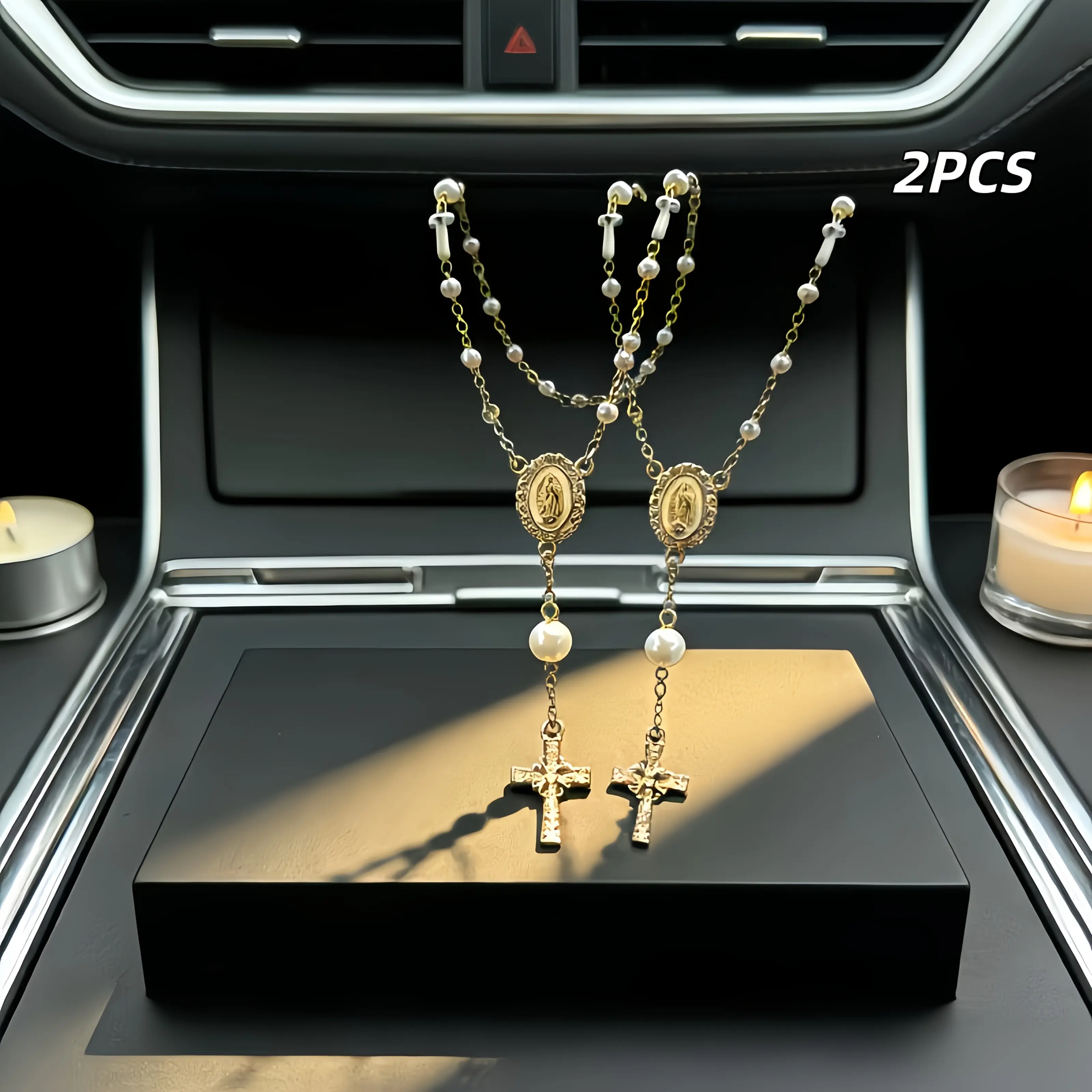 2 Pcs Luxury Our Lady of Guadalupe Car Rosary Hanging Ornament | Pearl Bead Car Rearview Mirror Pendant | Catholic Blessing and Protection Charm | Christmas and Valentine'S Day Gift, Baptism Gift, Car Decoration, Daily Driving Safety Blessing