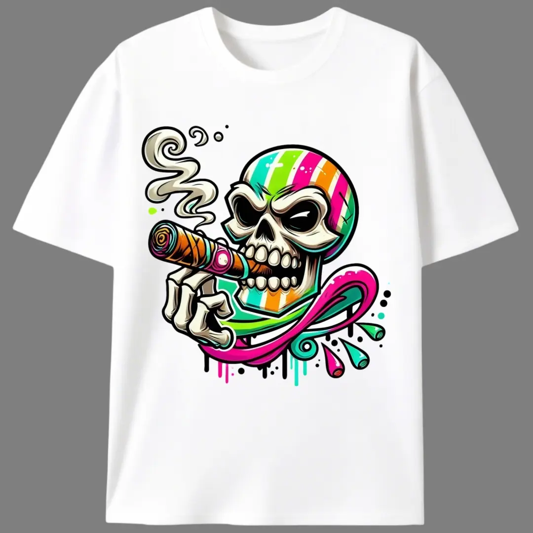 Rainbow Cigar Skeleton Summer T-Shirt, Men's Unisex Streetwear Graphic Tee, Cool Candy Colored Skeleton Casual Shirt for Hip-Hop Lovers