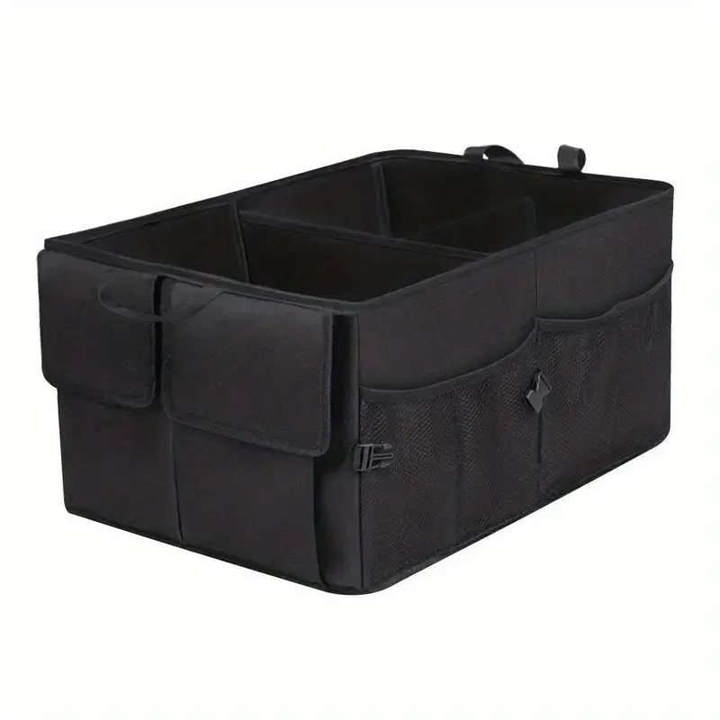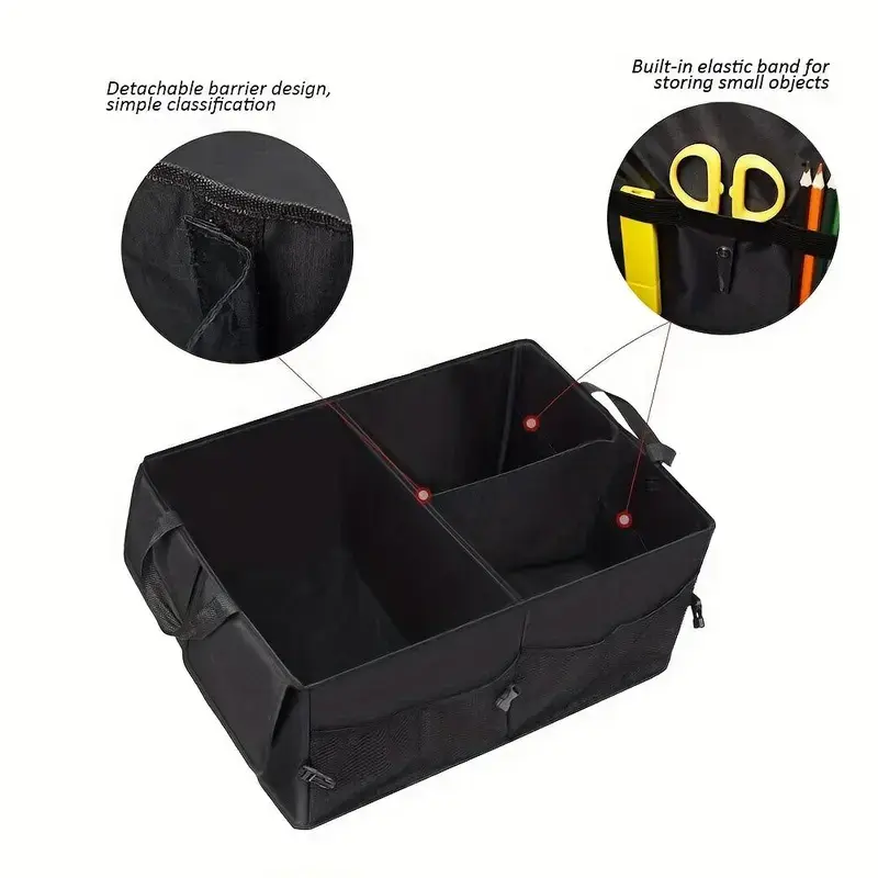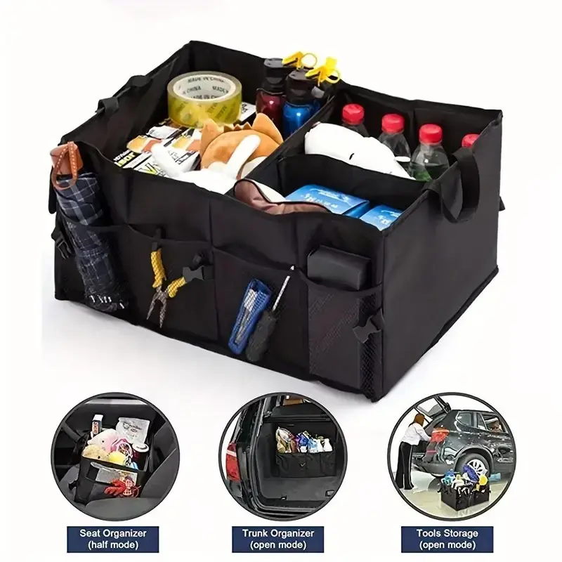 3 large main divided compartments with adjustable dividers to customize storage space for groceries, tools, emergency kits, sports gear, and more
