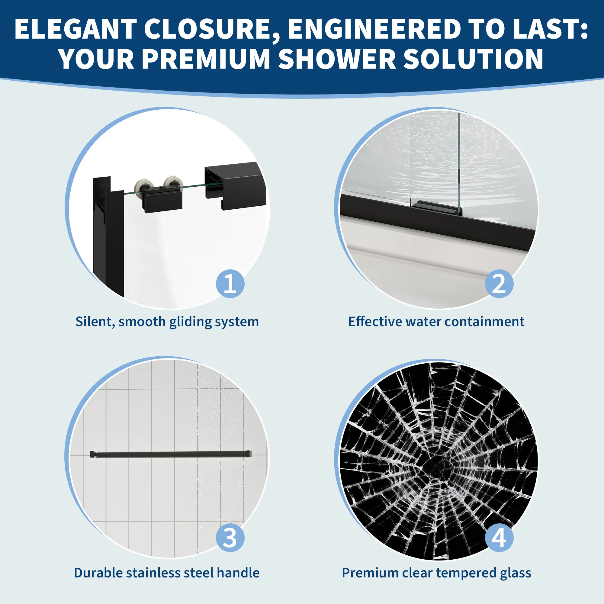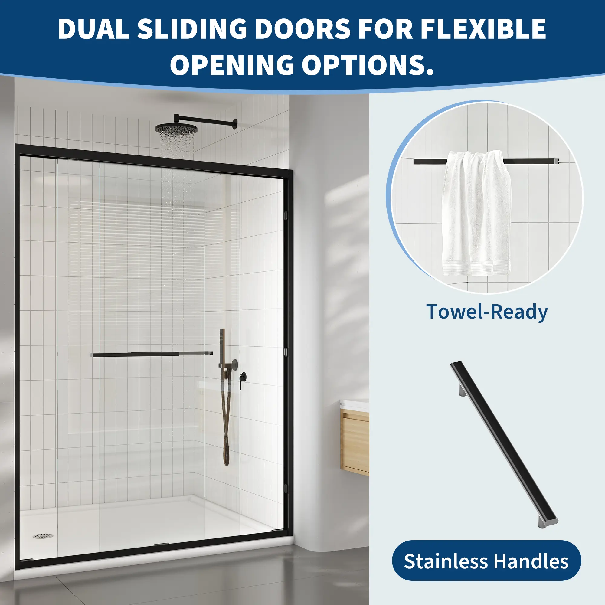 ·【Keep Water Where It Belongs】: Say goodbye to soggy bath mats. Full-length magnetic seals snap the double sliding glass shower door panels shut tightly. This creates a reliable barrier that keeps water inside the shower, ensuring your floor stays dry and safe every morning.