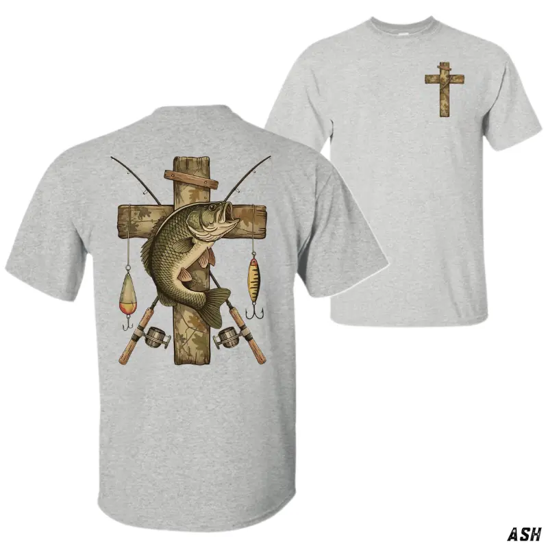 #ChristianFishingTShirt #BassFishCrossTee #FaithFishingShirt #RusticAnglerApparel #OutdoorFishermanTop #CountryFishingGift #RodAndLureDesign #MensWomensFishingTee