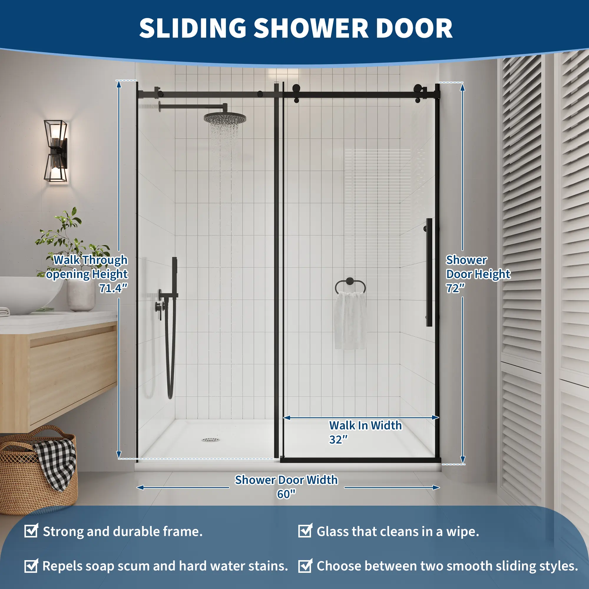 ·【Slides Like Butter, Stays Quiet】: No jerky tracks, no rattling. The rollers are engineered for smooth, silent gliding, so you can open and close this sliding door without waking up the whole house. Whether you're sneaking in a late-night rinse or an early morning rinse, it moves with you.