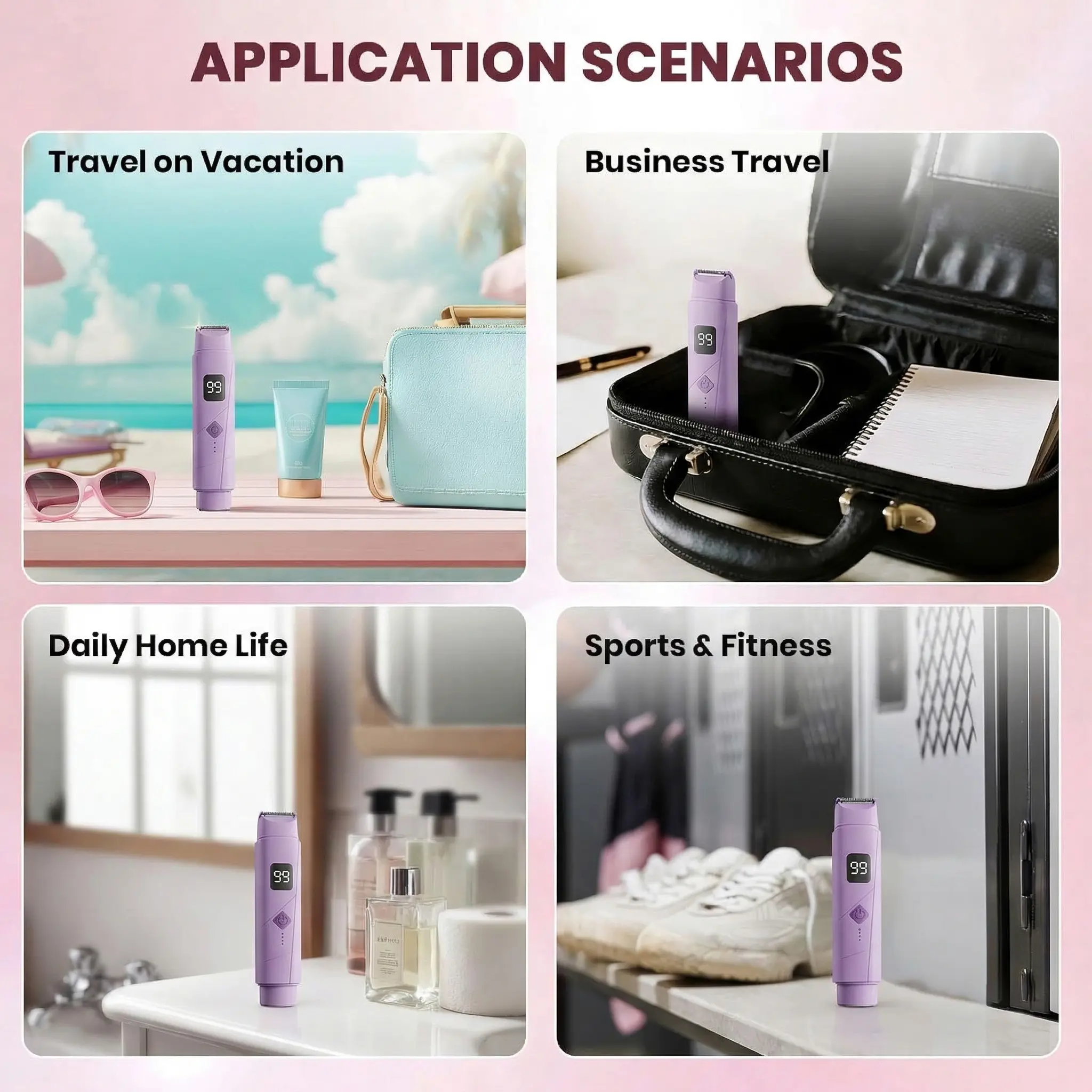 This portable 2-in-1 women's hair removal device is designed for easy and gentle trimming on multiple body areas, including the bikini line, underarms, arms, and legs. With dual heads, a built-in rechargeable battery, waterproof design, LED display, low-noise operation, and Type-C charging, it offers convenient grooming at home or while traveling.