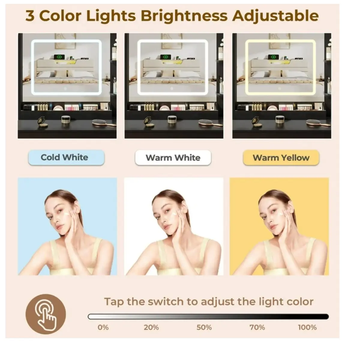 -Features a mirror with 3 light settings—cold white, warm white, and warm yellow. Touch switch to change colors, long press to adjust brightness.