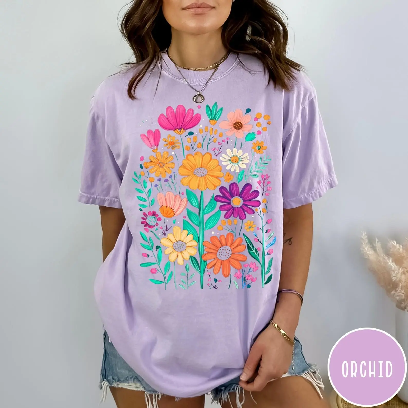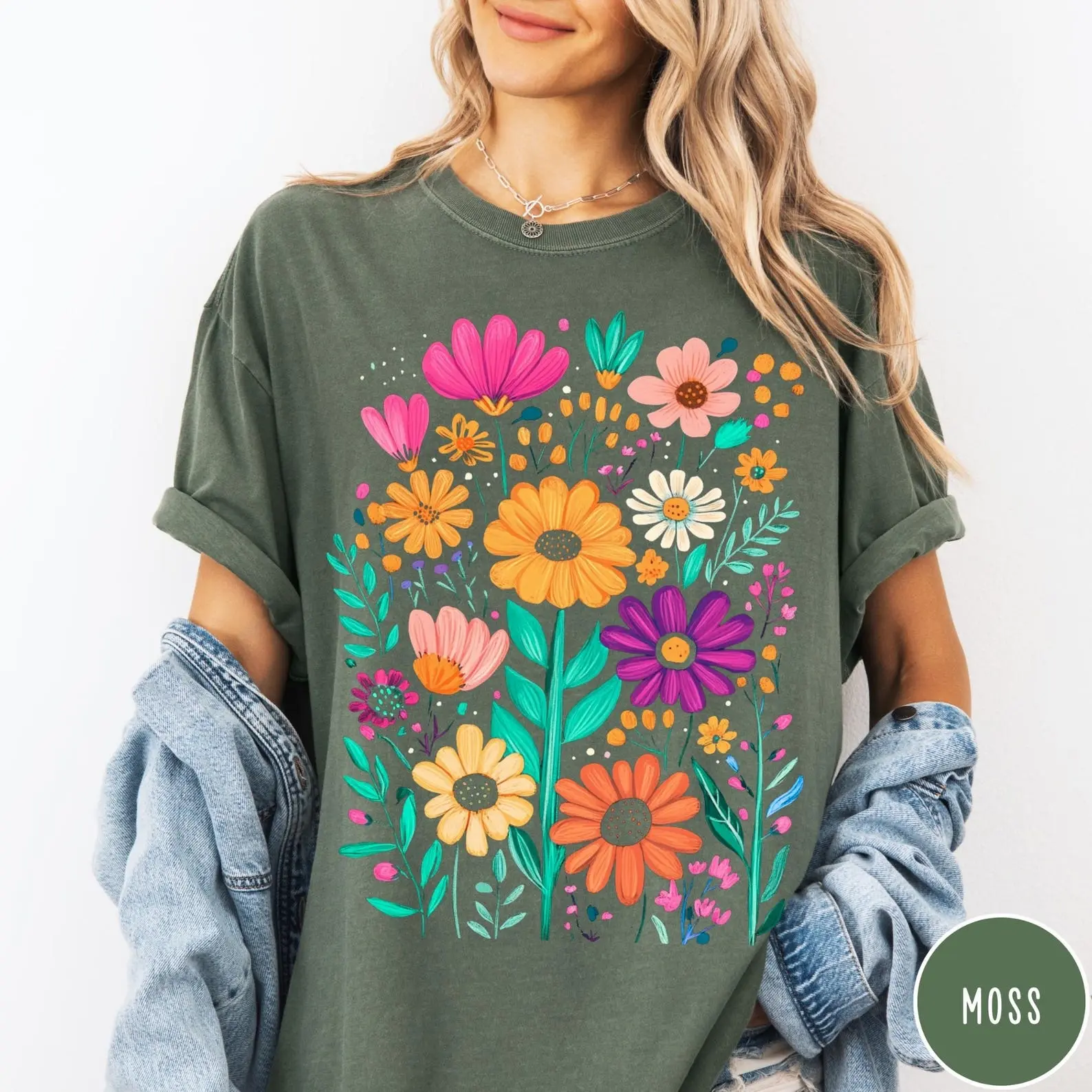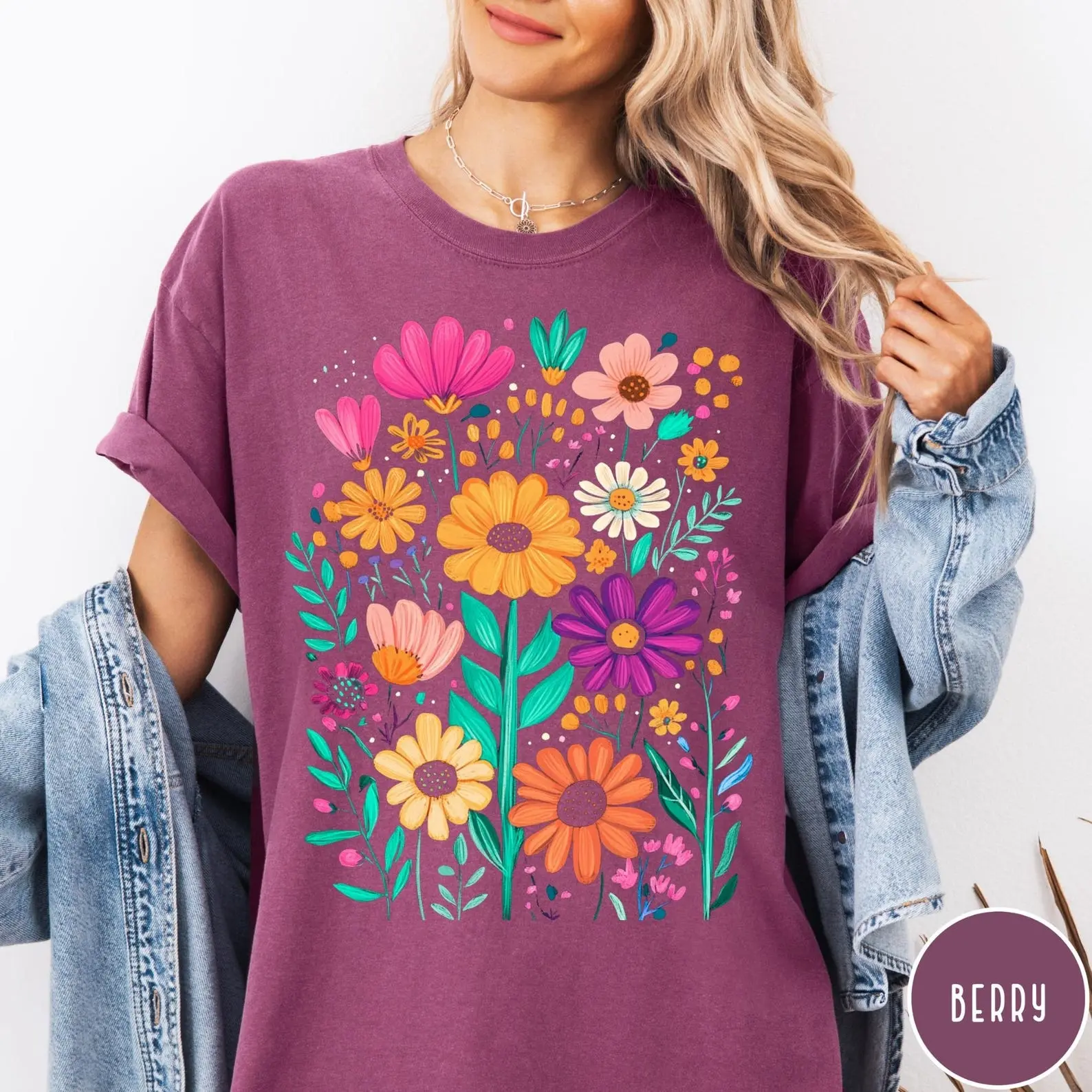 5. Comfort Colors Retro Wildflowers Graphic Top – Casual Crewneck T-Shirt For Womenswear Summer