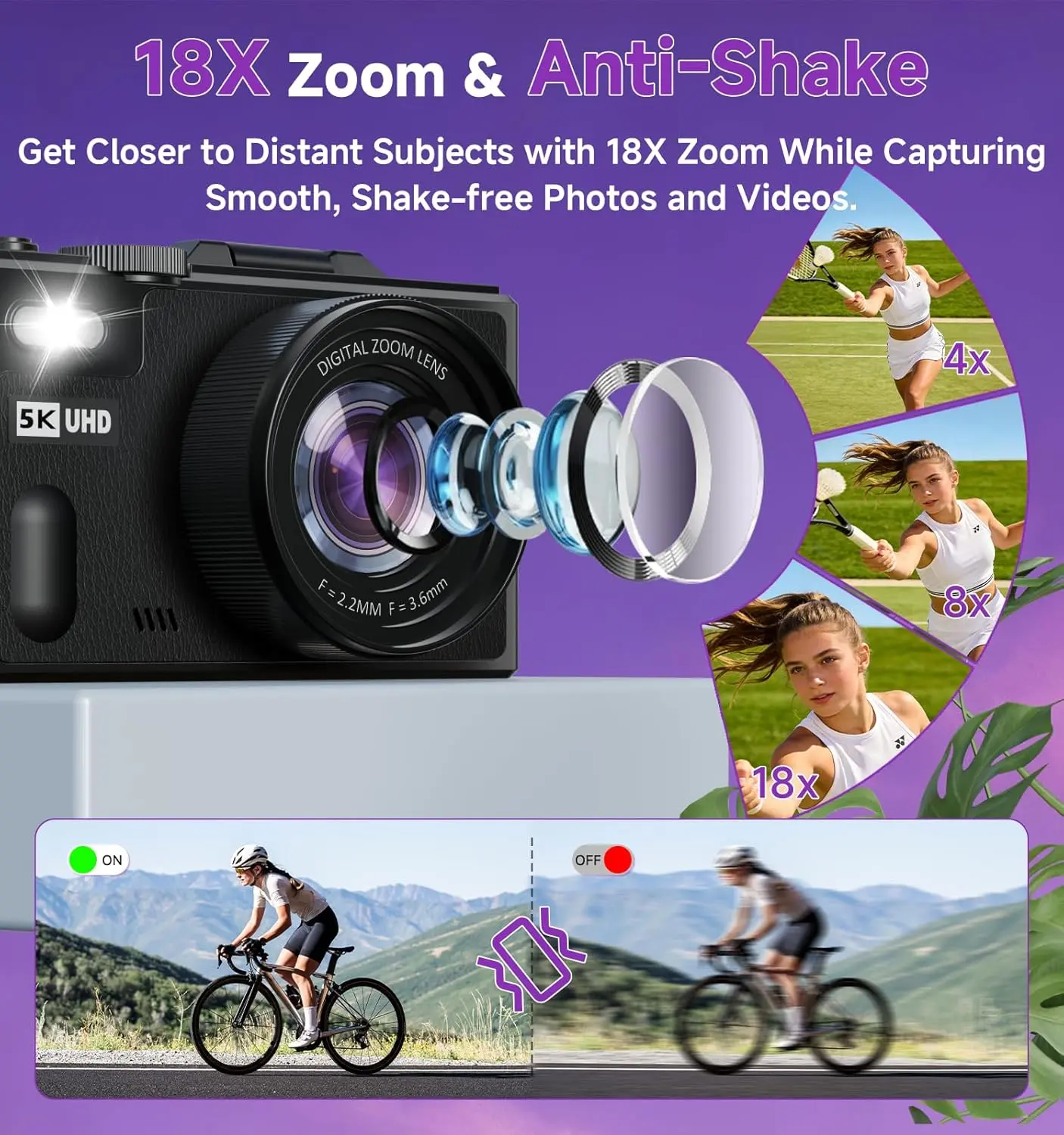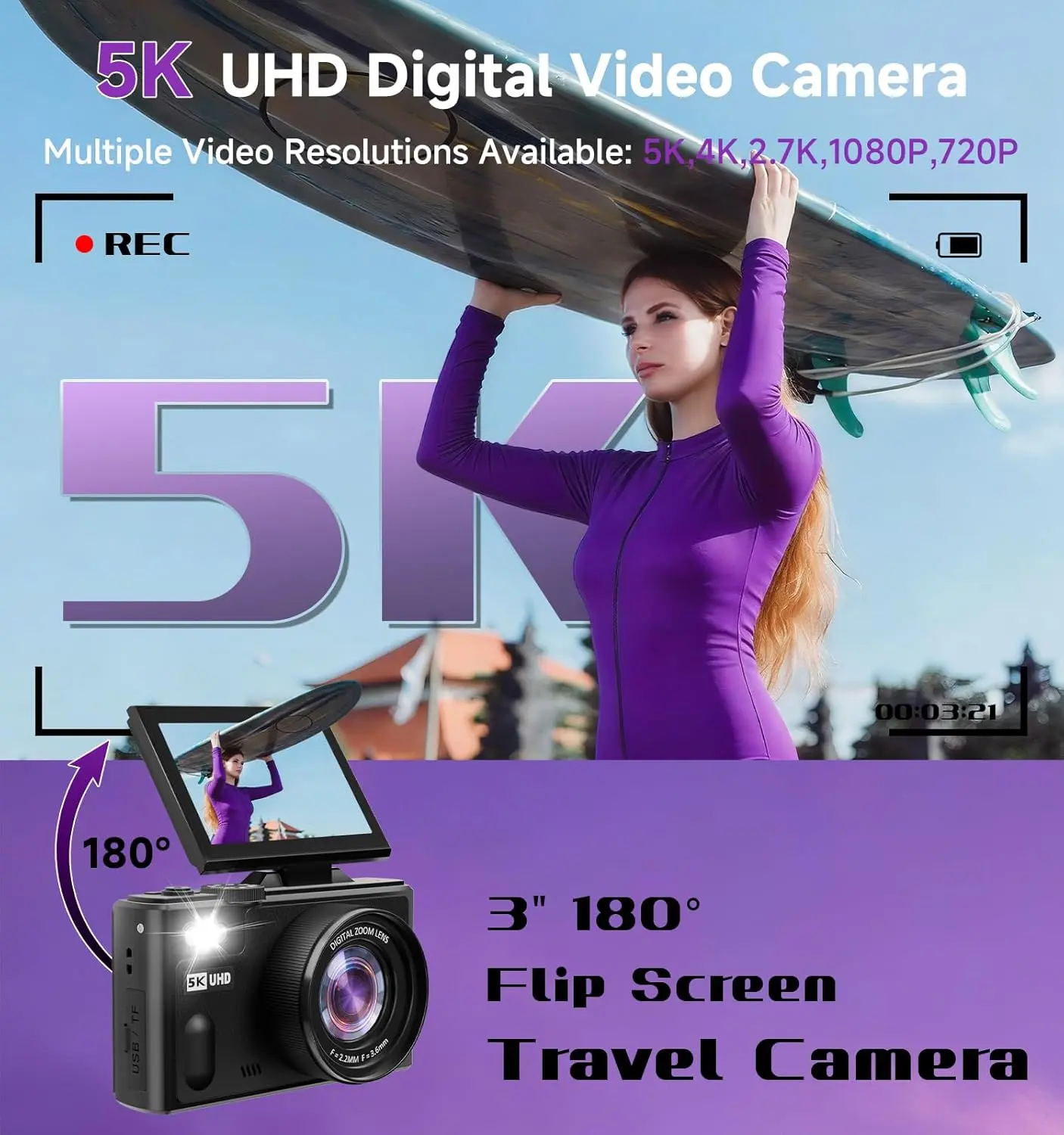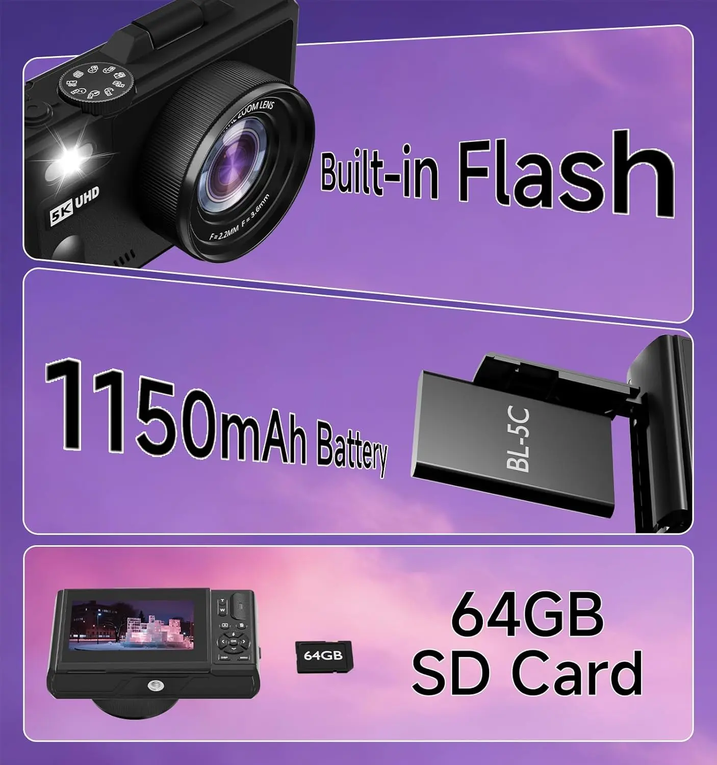 ·Stunning 5K Video & 80MP Image Clarity: Capture every moment with crisp, vibrant detail using this 5K digital camera. With 80MP photo resolution, and built-in flash with advanced CMOS sensor, it delivers amazing shots even in low-light conditions.