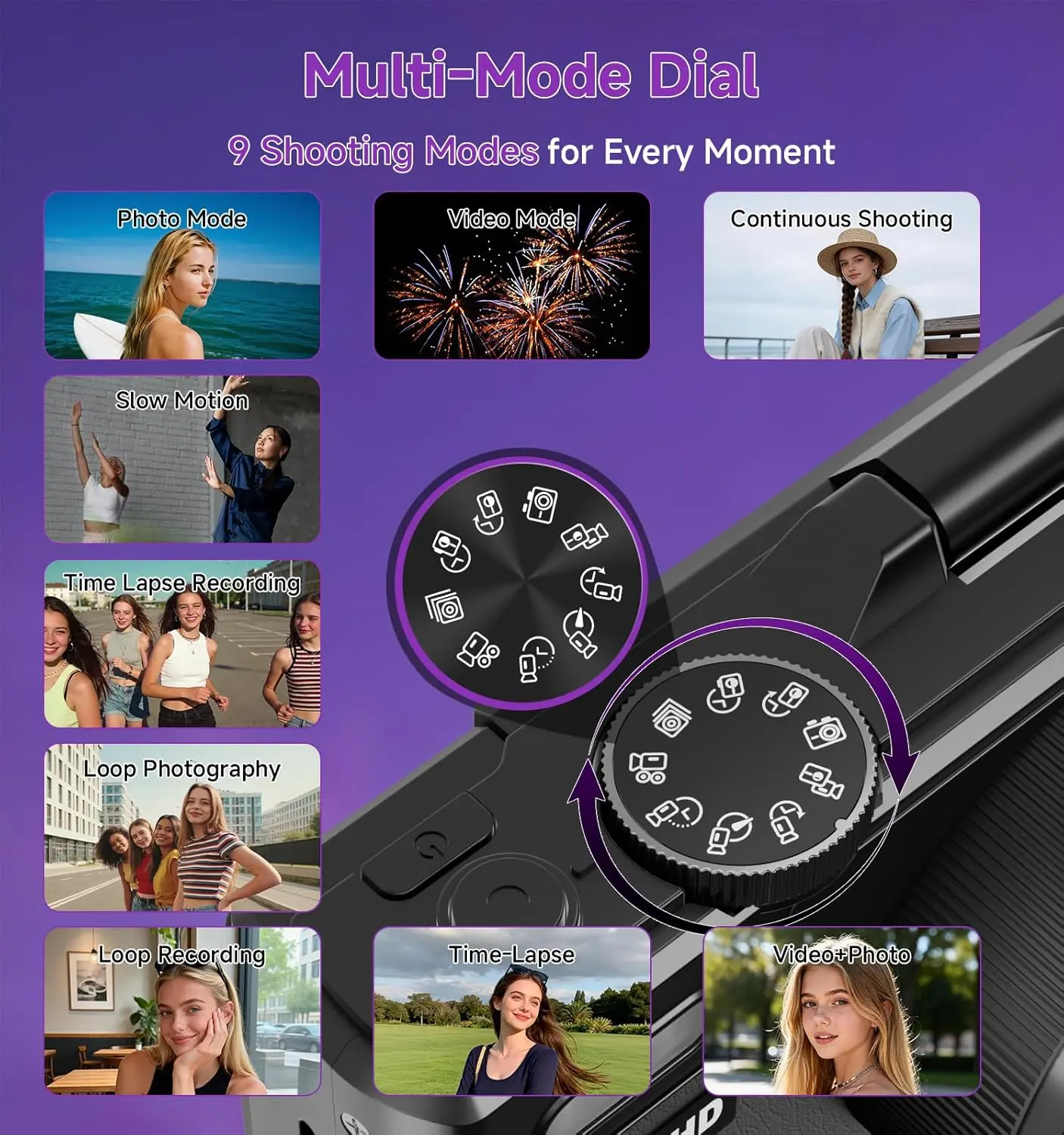 ·9-Mode Camera for Beginners: Easily switch between 9 shooting modes, including photo, video, slow motion, time-lapse, and burst—using the intuitive dial. It adapts to every scene, from fast action to creative filming, making it ideal for travel, daily vlogs, parties, and special moments. Use it as a webcam for video calls, transfer files via USB.