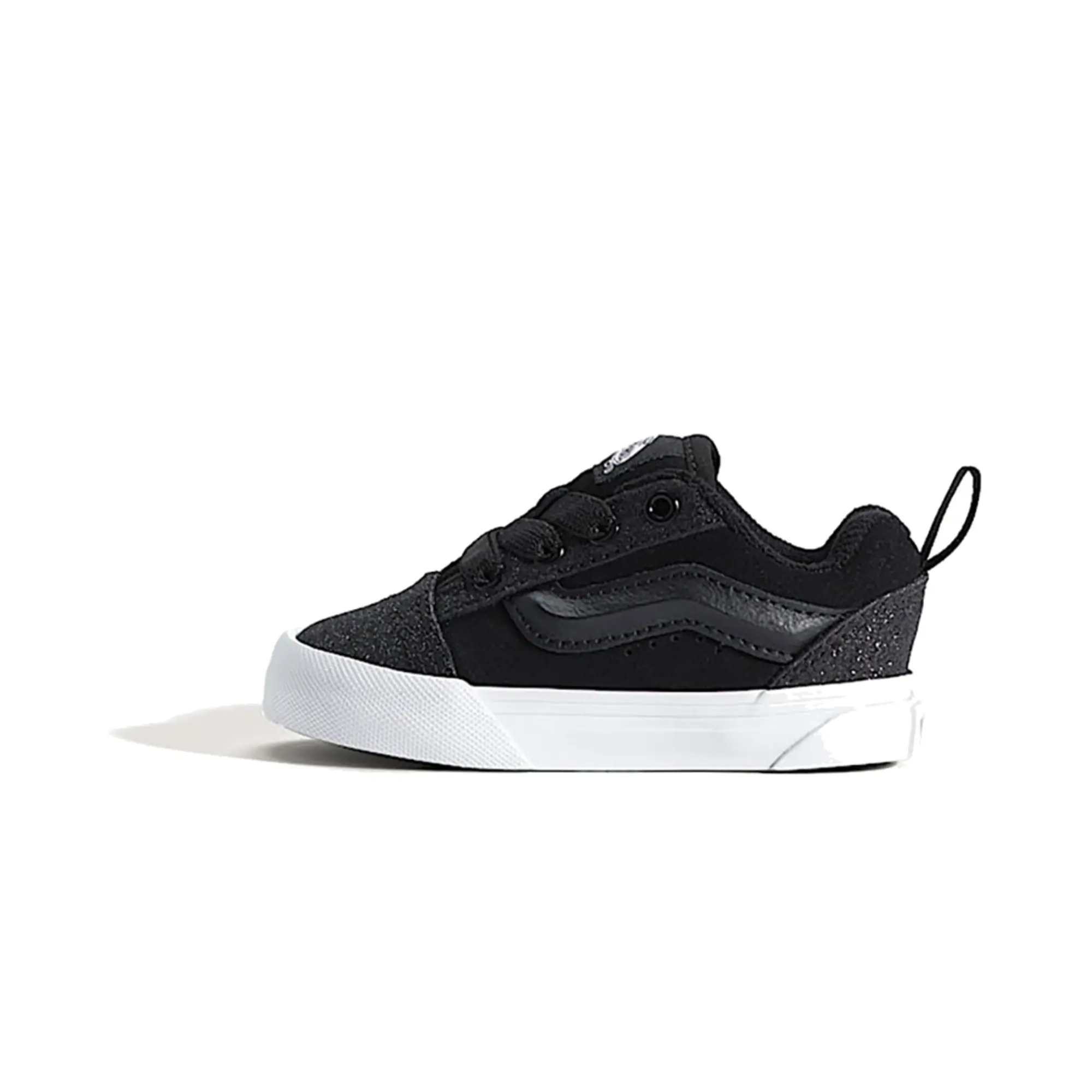 The Vans Knu Skool "Dazzled Black" delivers a clinical, high-status execution of the oversized 90s skate legend, masterfully blending "Off The Wall" heritage with a radical, shimmer-infused technicality. This Toddler exclusive features a premium landscape of black suede and "Dazzled" glitter-encrusted canvas, providing a high-contrast, multi-dimensional foundation for the model’s chunky anatomical profile. The design is defined by its artisanal strike, utilizing specialized 3D-molded "Sidestripes" and elastic laces that inject a layer of high-octane luxury into the scaled-down skate build. Grounded by a massive white vulcanized midsole for elite durability and finished with the signature rubber waffle outsole for superior grip, this release successfully pairs the Knu Skool’s aggressive DNA with a sophisticated, "Glitter-Skate-Elite" aesthetic.