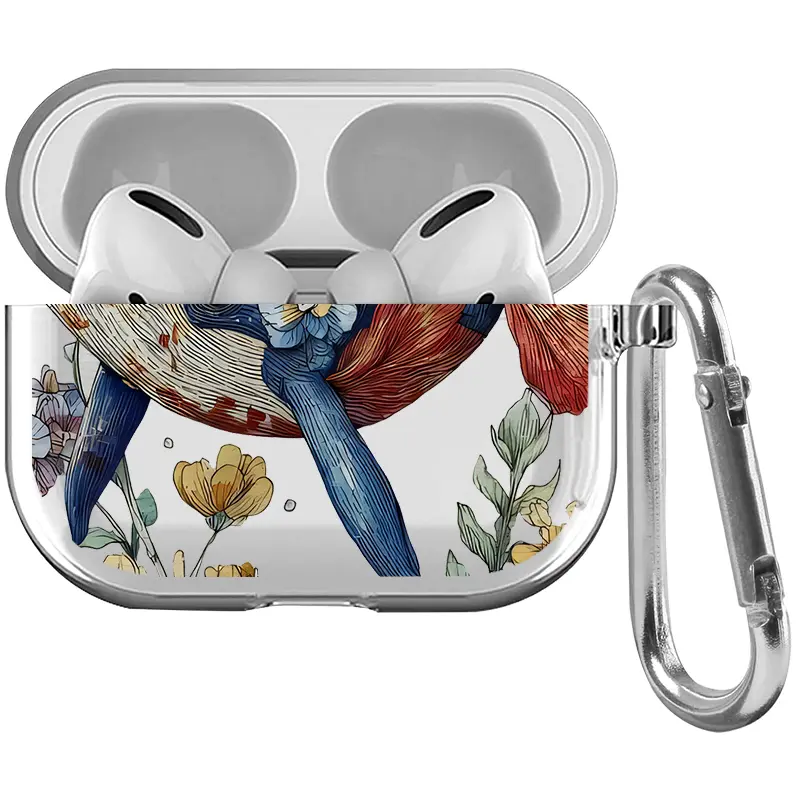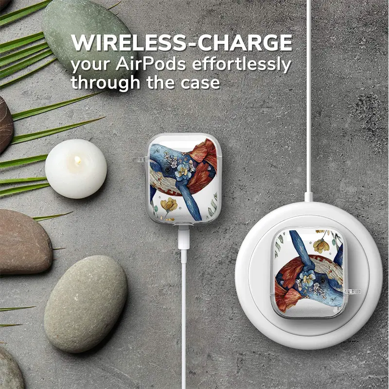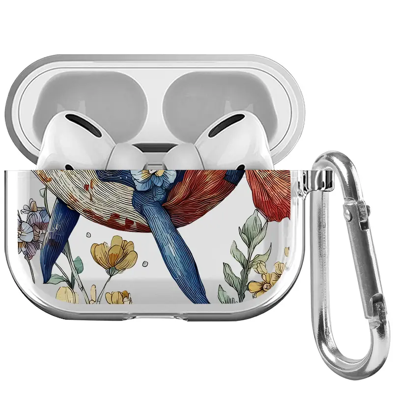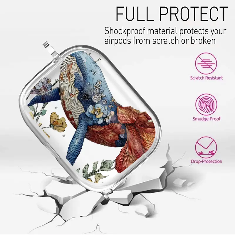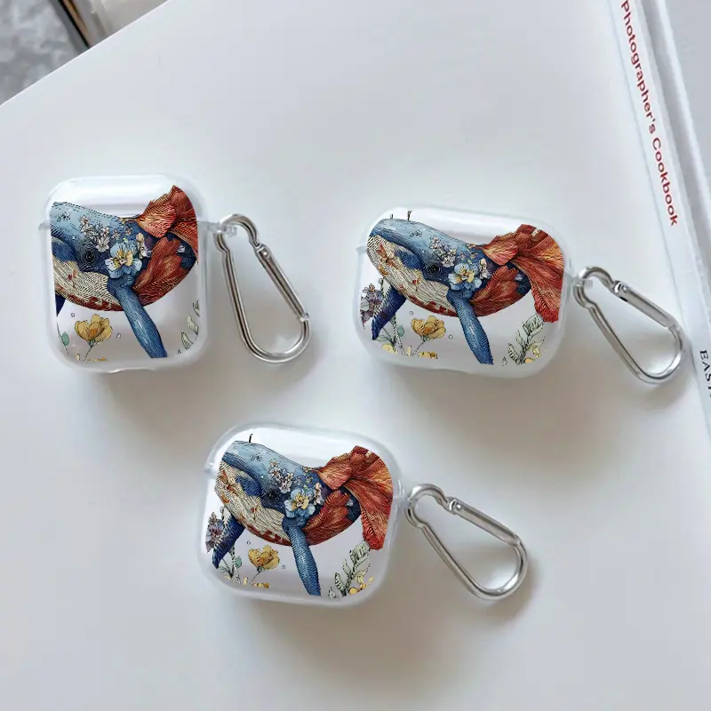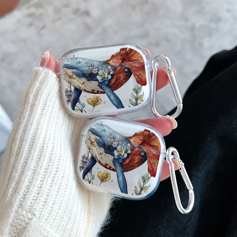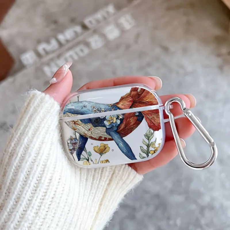 Whale in Bloom Pattern TPU Soft Protective Case for Apple AirPods 4/3/2/1/Pro/Pro2 Transparent Earphone Cover with Keychain Attachment