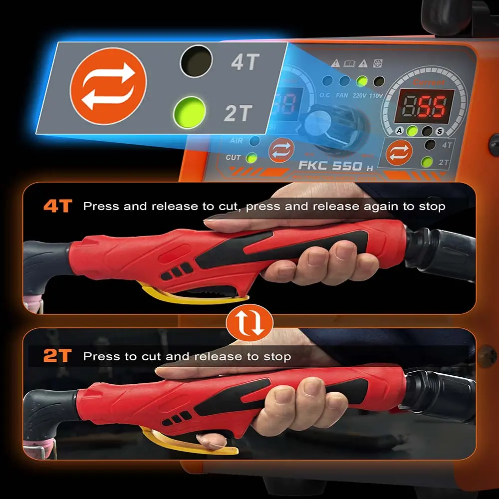 2T Mode: Perfect for short, precise cuts. 4T Mode: Reduces operator fatigue for long, continuous cutting. Adjustable post-flow time (2-15 seconds) cools the torch head, ensuring a cleaner cut surface and extending the torch’s service life.