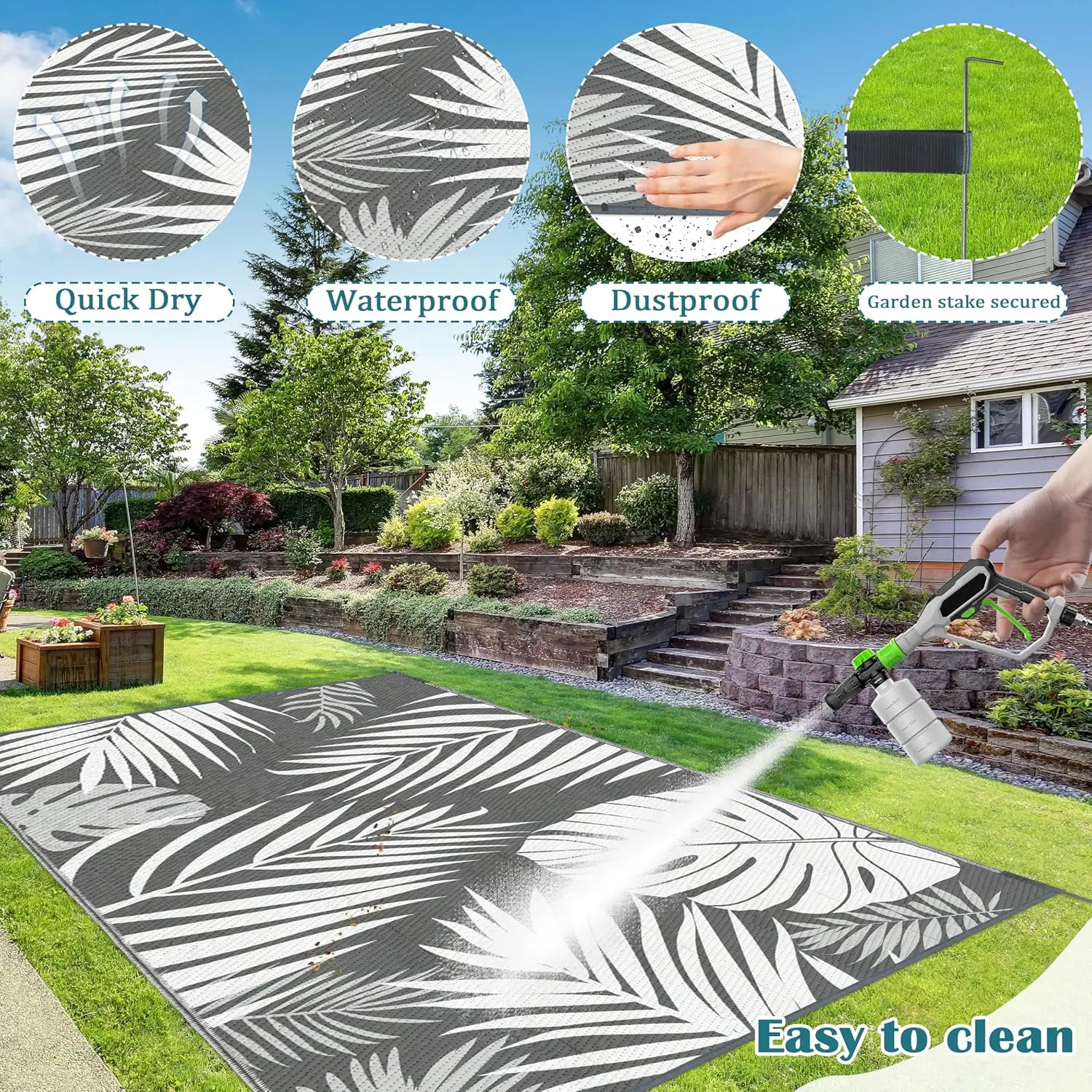 ·UV Resistance: Our outdoor plastic reversible rugs have UV coating that can resist high temperatures and prevent damage caused by sunlight, such as fading and aging. Note: Due to different lighting conditions, the color of the rug may differ from the image. Using in the shade can increase the lifespan of outdoor rugs.