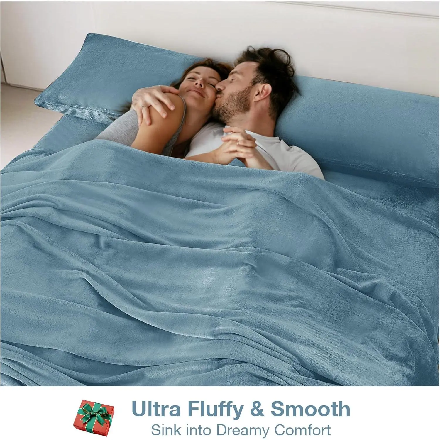 Experience incredible softness with our queen fleece sheets.These warm and plush light blue sheets are soft as flannel sheets, creating a cozy, comfortable sleep all winter long for youOur premium queen size winter cold sheets are crafted from 200 GSM polar fleece.These light blue microfleece sheets are lightweight yet incredibly warm as flannel sheets4-piece queen size fleece bed sheet set includes 1 fitted Sheet: 60"*80" + 15", 1 flat sheet: 90"*102" and 2 standard pillowcases: 20"*30".Deep pocket velvet fitted sheet with elastic fit most mattresses perfectlyEasy Care: Queen micro fleece Sheets are machine washable, tumble dry low.Fade, shrink, and pill resistant as flannel sheets.Please avoid long-term mixing with other fabrics to reduce pillingSnuggle into our fuzzy and velvet sheets for a flannel like smooth, soft, cozy feel. If the fluffy sheet set should wear out in less than 1 year(normal use only), contact seller to replace it
