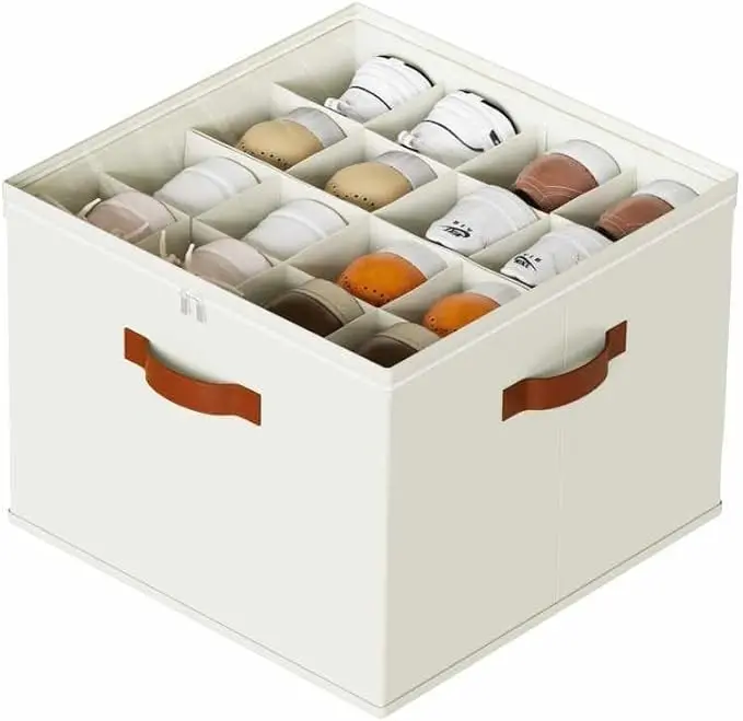 Shoe Storage Box Organizer with Adjustable Dividers Transparent Cover Handles on 3 Sides Beige 17x17x12.5 Inches for Efficient Storage