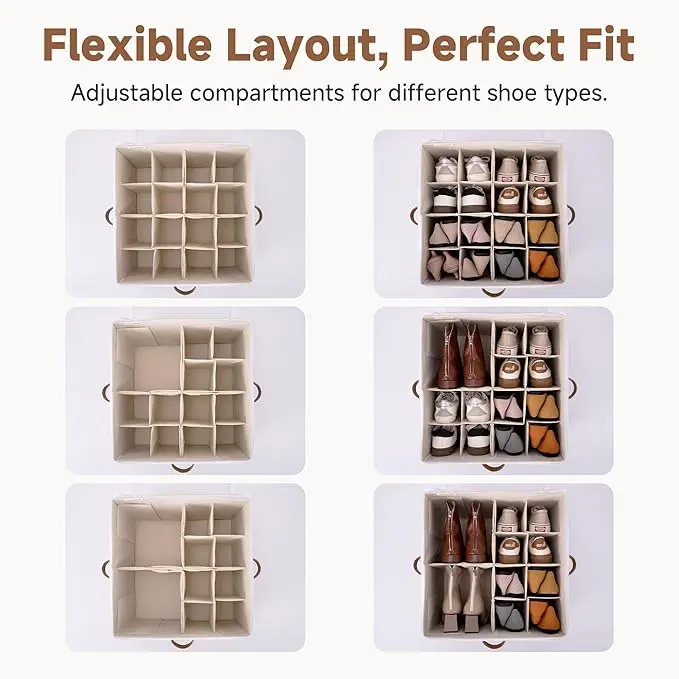 ·CUSTOMIZABLE COMPARTMENTS: Equipped with adjustable dividers that can be reconfigured to create custom-sized sections for optimal organization of different shoe types