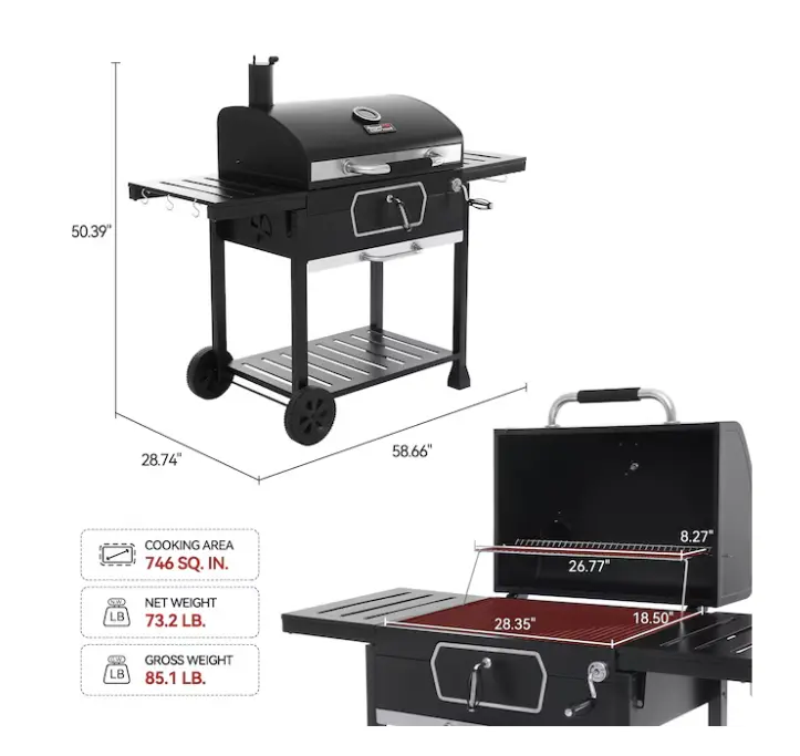 This grill offers a versatile grilling experience. With its 28.35-inch width, it accommodates various sizes of food. The charcoal setup ensures a traditional grilling flavor. Perfect for family gatherings or small parties, it provides a reliable cooking solution. Enjoy the simplicity and efficiency of this grill.