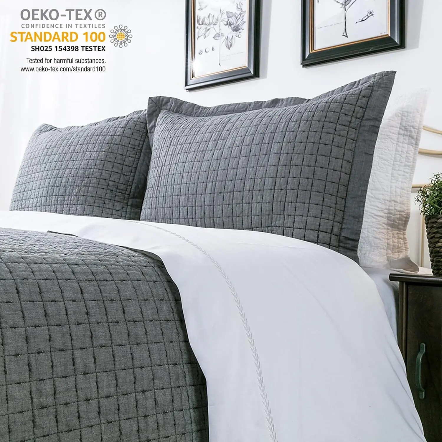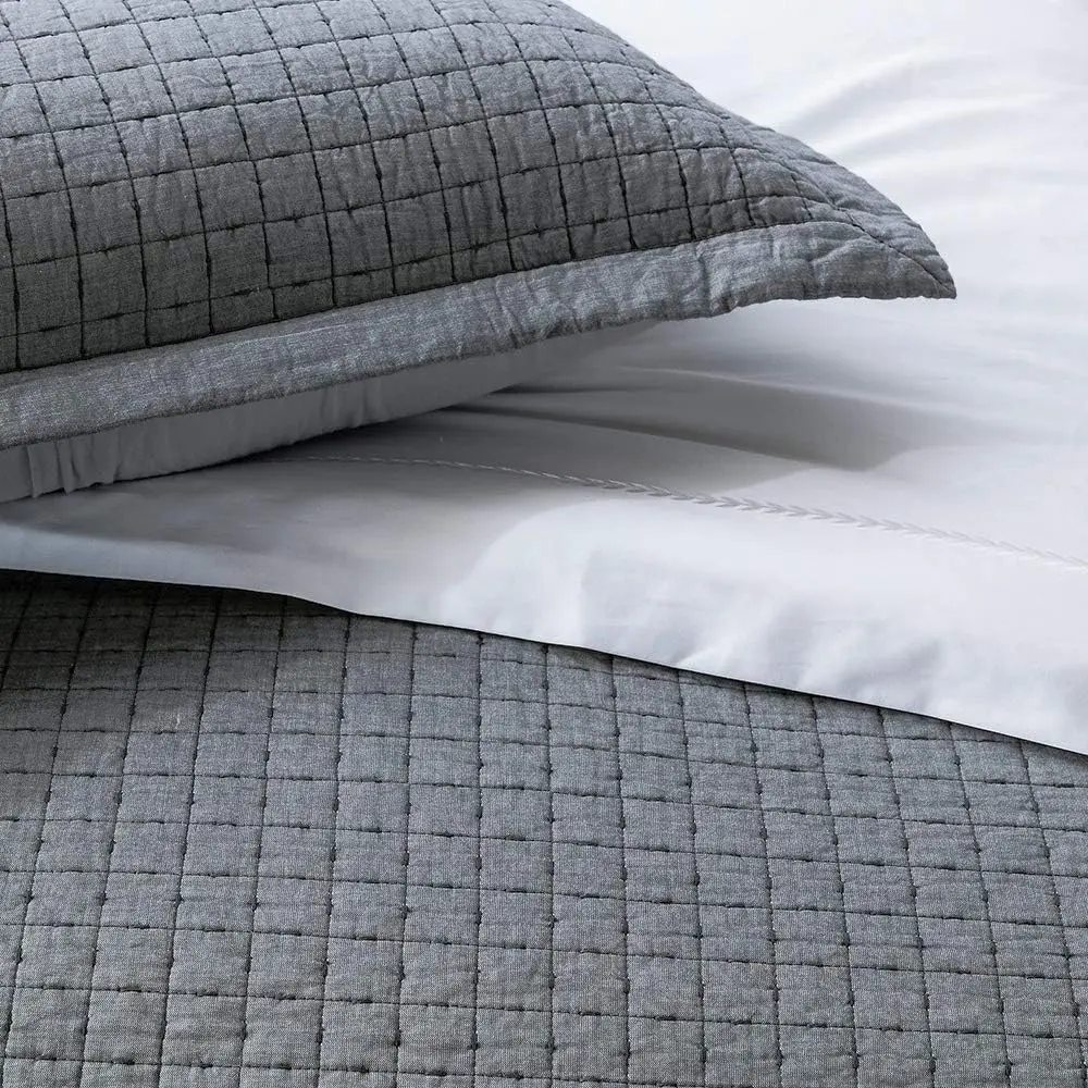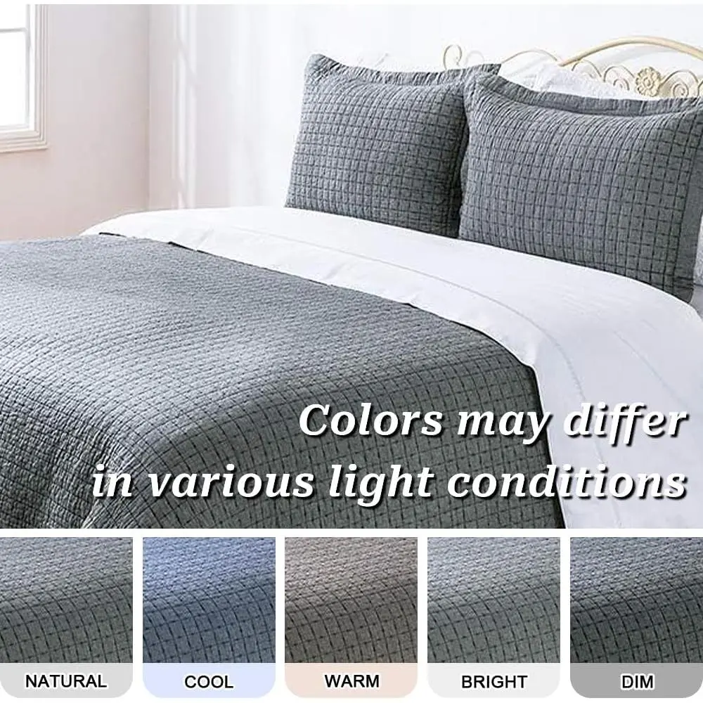 [𝟏𝟎𝟎% 𝐂𝐎𝐓𝐓𝐎𝐍]The quilt is made of Cotton Yarn Dyed Chambray face fabric and cotton reverse fabric, with 200 GSM (grams per square meter) cotton filling.Pure natural material, soft and skin-friendly, beautiful and proper thickness for all seasons.[𝐑𝐄𝐕𝐄𝐑𝐒𝐈𝐁𝐋𝐄]Reversible with dainty square allover embroidery, 1.75" flange with mitered corner.The quilt provides wonderful sleeping comfort.This quilted coverlet with lightweight and comfortable hand feel can be used as a throw, blanket or bed cover.[𝐌𝐔𝐋𝐓𝐈𝐏𝐋𝐄 𝐂𝐇𝐎𝐈𝐂𝐄𝐒]Size includes Twin 68’’ x 90’’, Queen 88’’ x 92’’, and Oversized King 108" x 92".Sham sold SEPARATELY, not as a set.[𝐄𝐀𝐒𝐘 𝐓𝐎 𝐂𝐀𝐑𝐄]The quilt has been pre-washed, pre-shrunk and softness, it is durable and quality.Machine wash cold separately, gentle cycle, tumble dry low.This cotton quilt becomes softer and fluffier after every wash and does not fade or shrink.[𝟏𝟎𝟎% 𝐒𝐀𝐓𝐈𝐒𝐅𝐀𝐂𝐓𝐈𝐎𝐍 𝐒𝐄𝐑𝐕𝐈𝐂𝐄]We strive for 100% Customer Satisfaction.Any problem or if you need any help,do feel free to contact us.