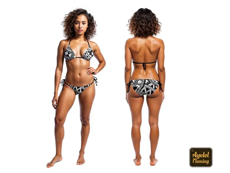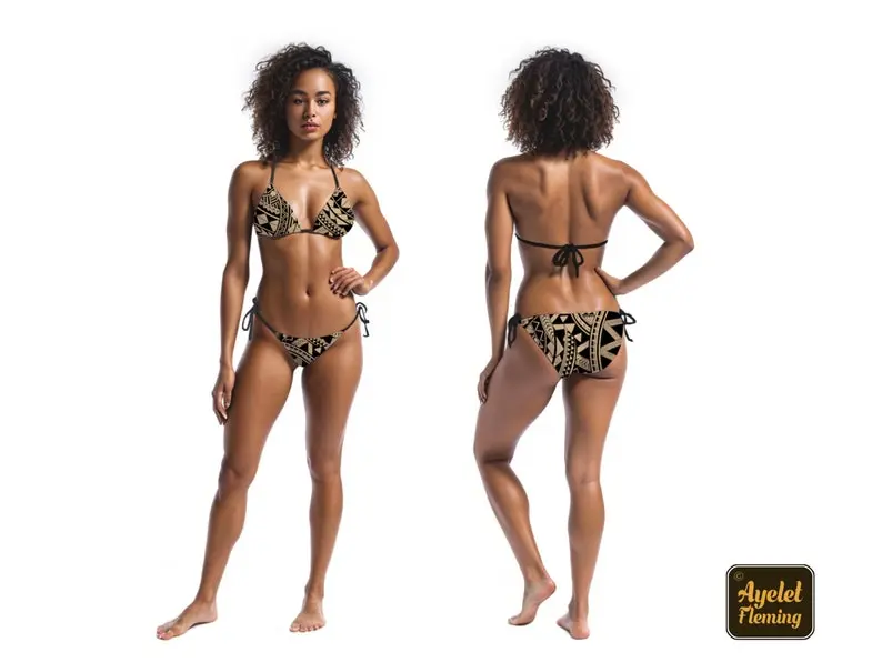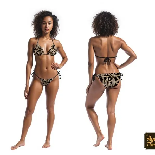 Matching His and Hers Polynesian Clothing Swimsuit Set Ethnic Tribal Pattern Triangle Bikini and Men Board Shorts