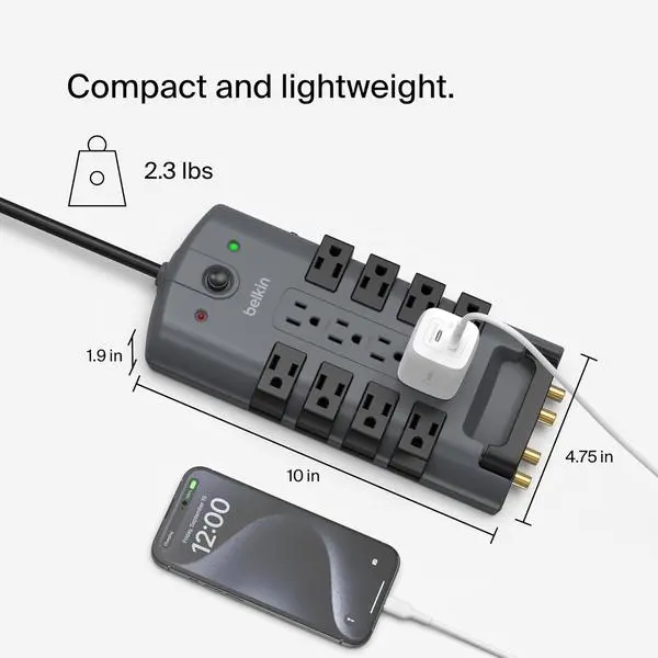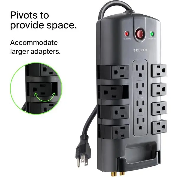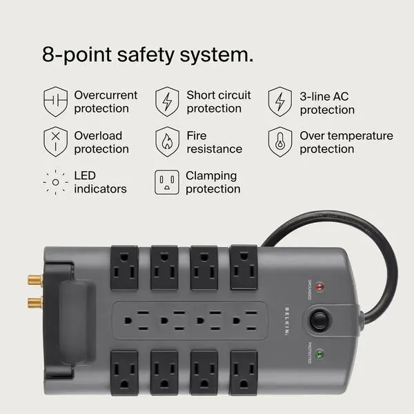 ·Full Specs: 6,000 volts max spike voltage, 15A AC (4 stationary and 8 rotating outlets), 125V, 1875W, and 150K Hz - 100M Hz EMI/RFI Noise Filter