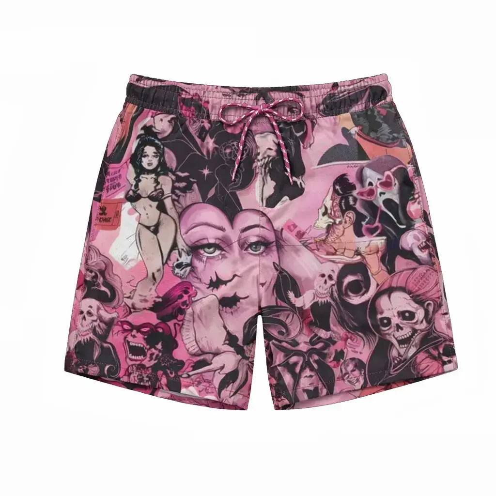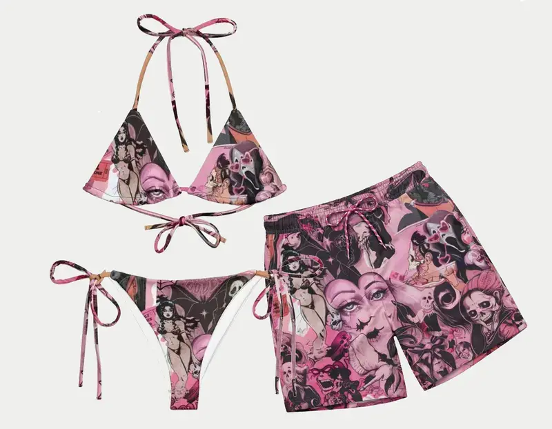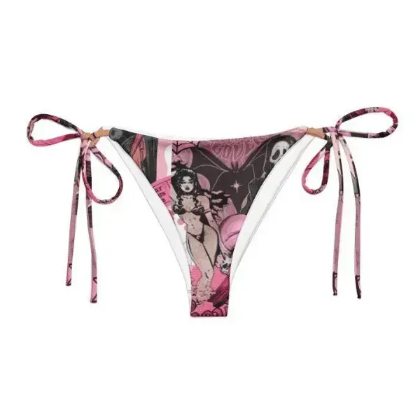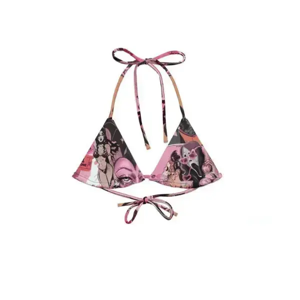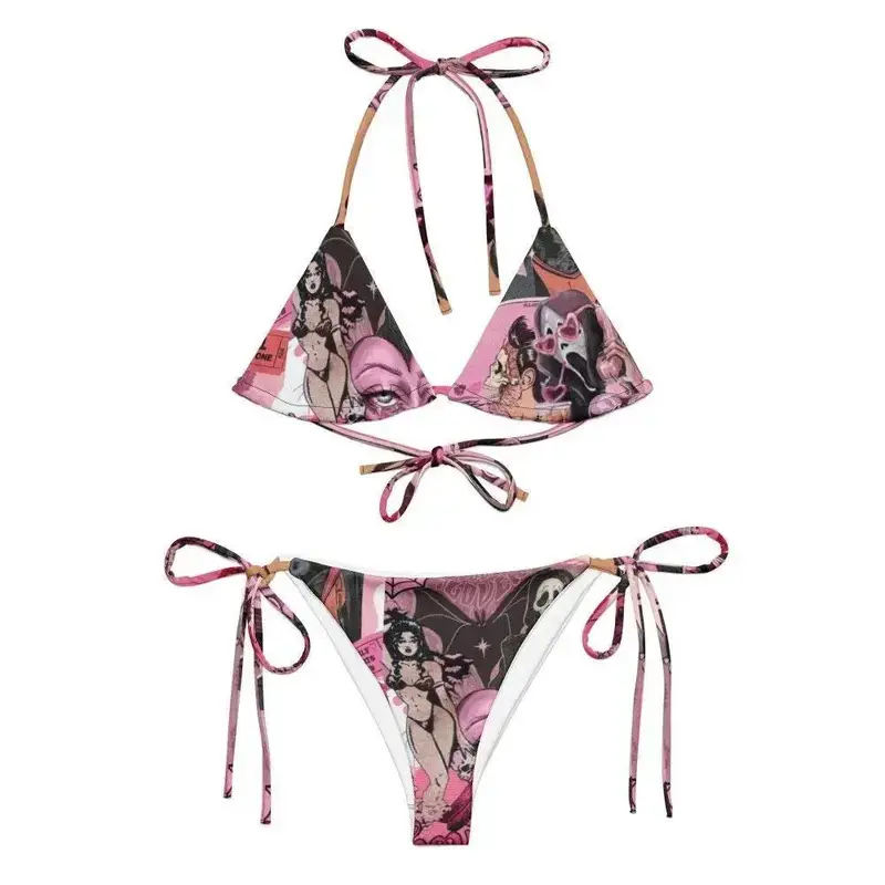5. Pink Gothic Comic Print Bikini Set, Y2K Aesthetic Triangle Tie-Up Swimsuit, Horror Graphic Bathing Suit