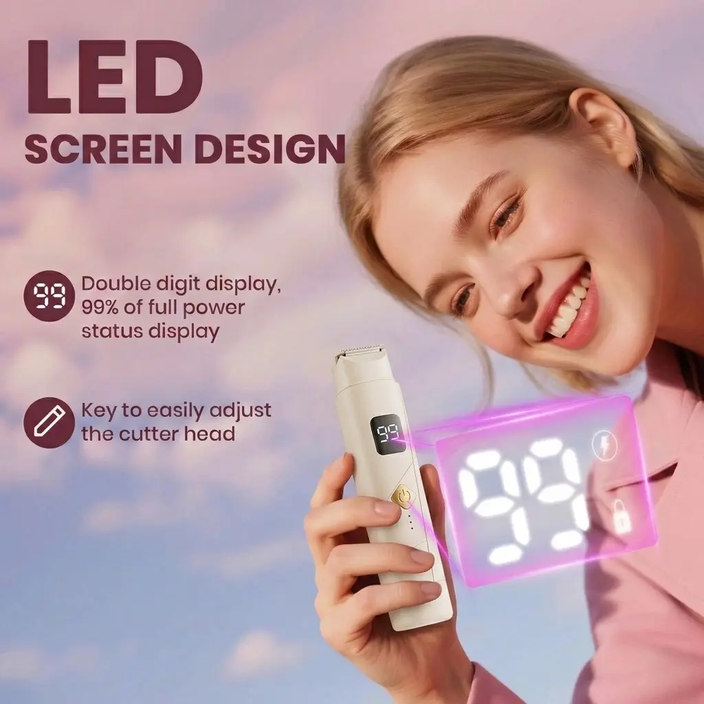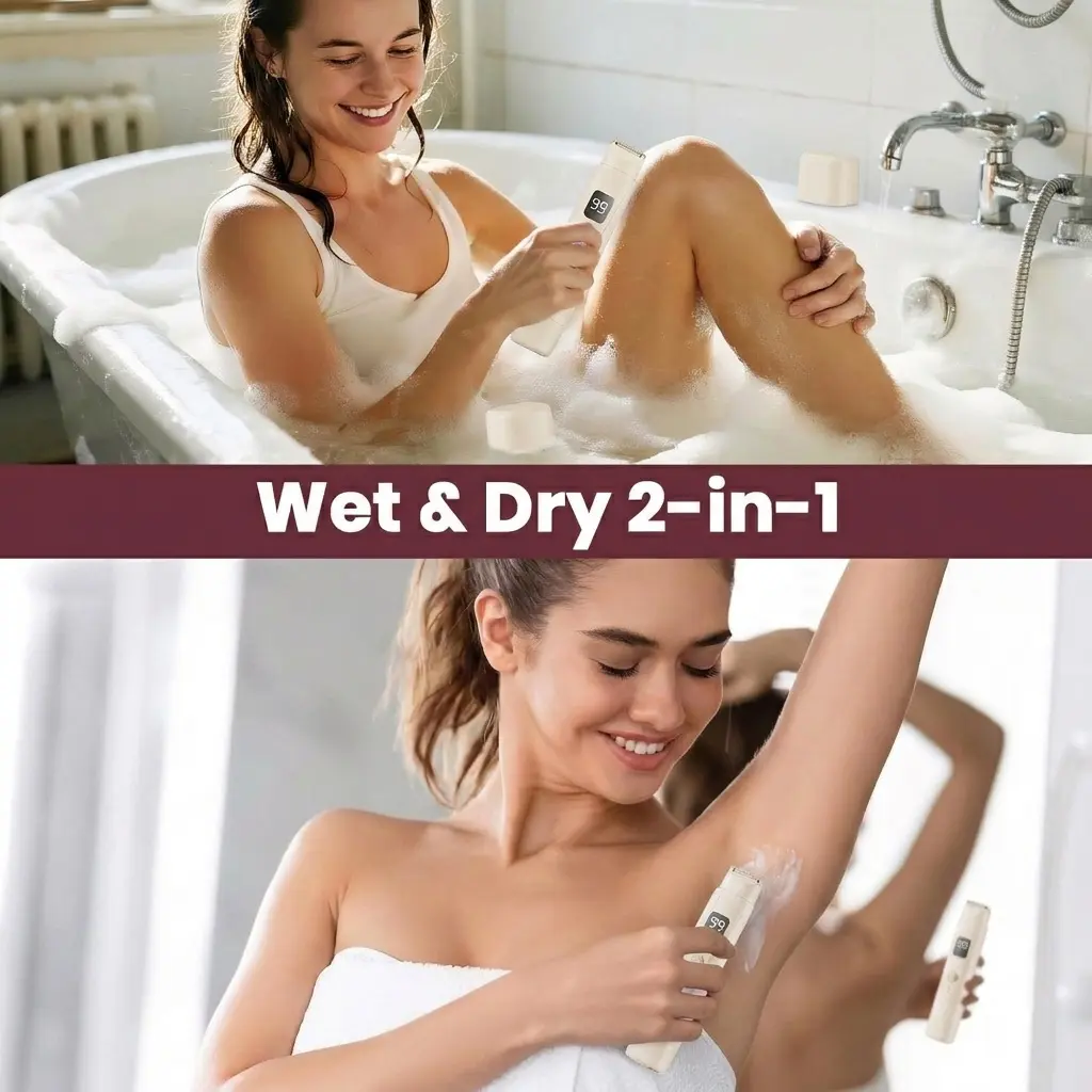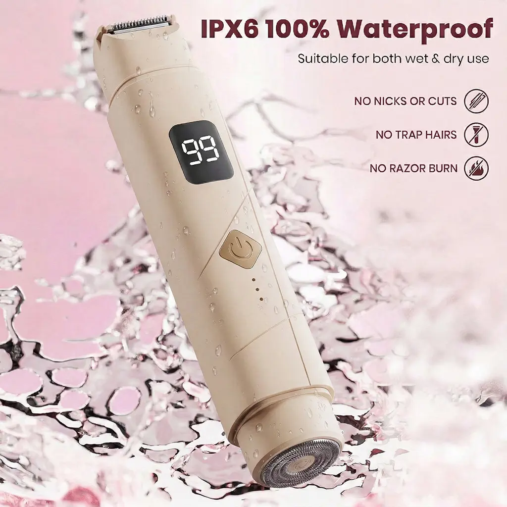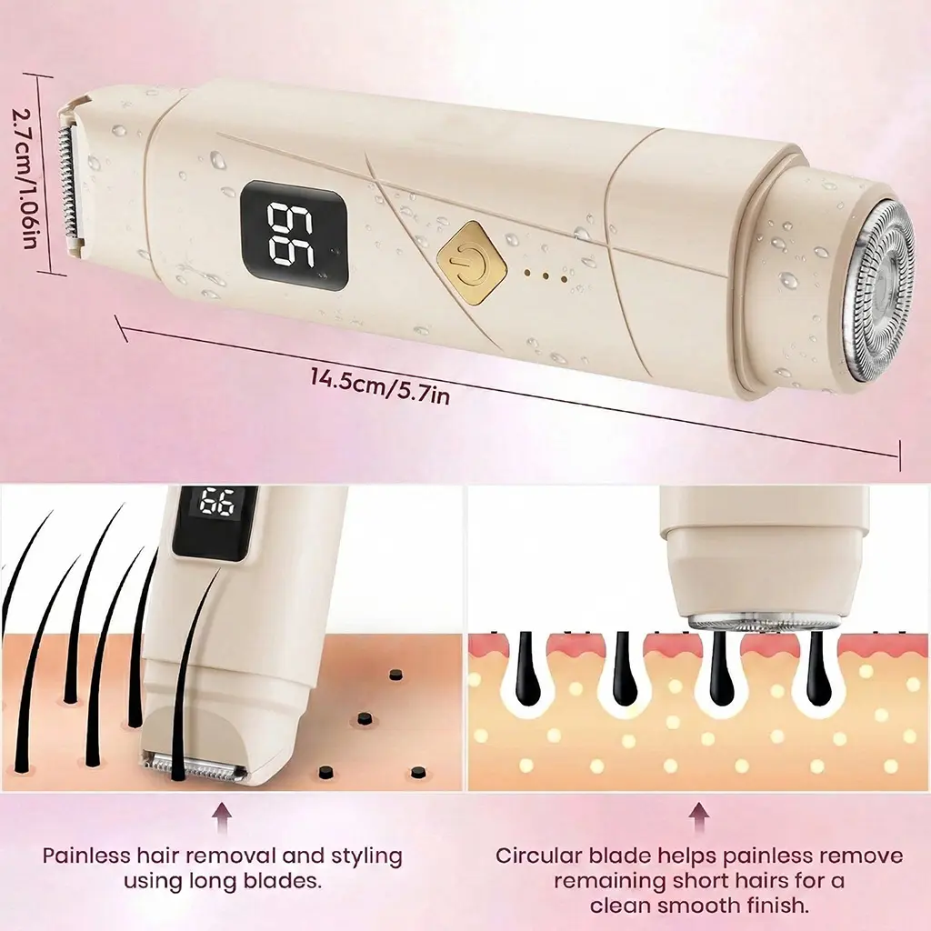 This portable 2-in-1 women's hair removal device is designed for easy and gentle trimming on multiple body areas, including the bikini line, underarms, arms, and legs. With dual heads, a built-in rechargeable battery, waterproof design, LED display, low-noise operation, and Type-C charging, it offers convenient grooming at home or while traveling.