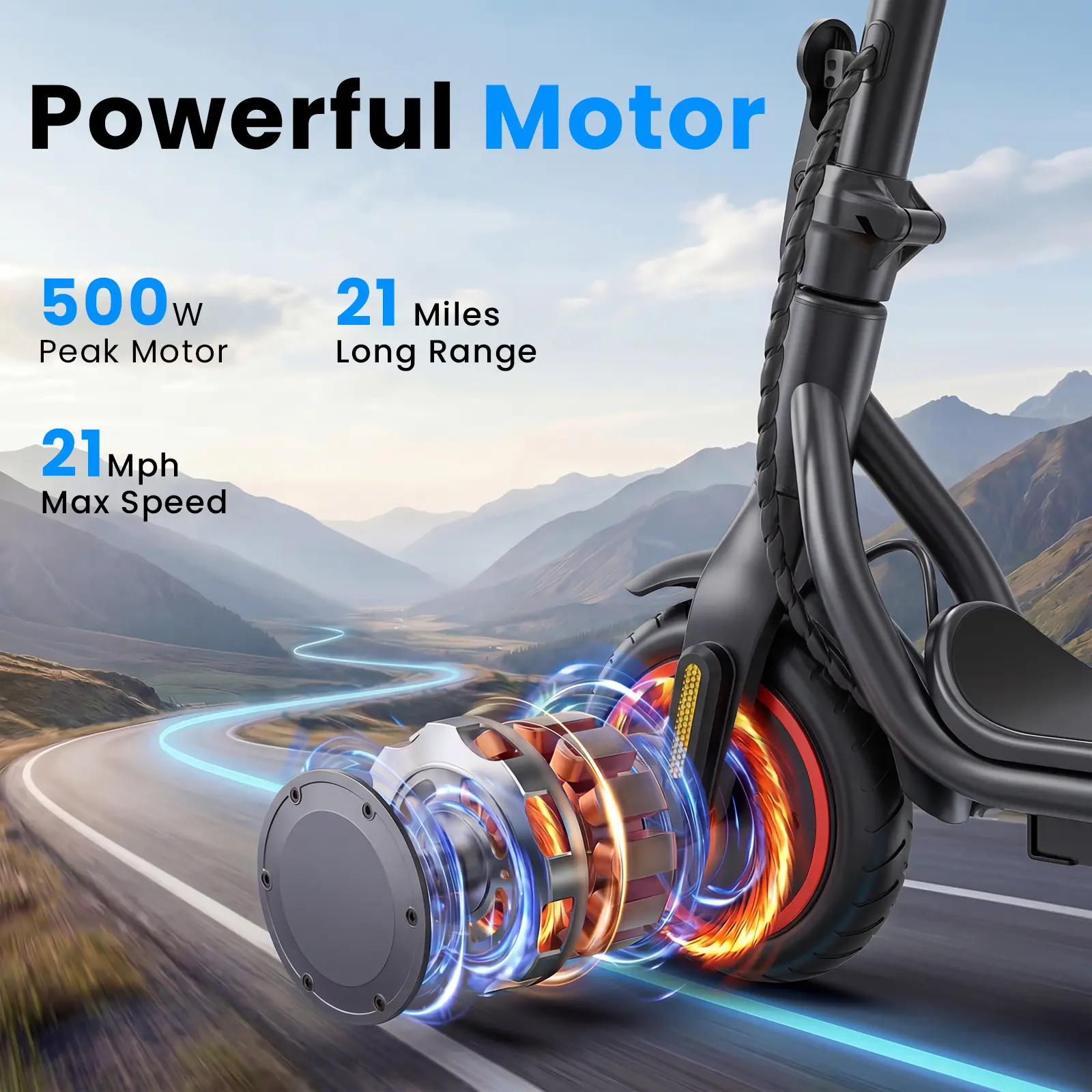 This electric scooter is equipped with a powerful 500W motor, reaching speeds up to 21 MPH. Easily switch between 3 riding modes: Eco (6 MPH), Drive (12 MPH), and Sport (21 MPH), delivering a smooth and efficient ride for daily commuting.