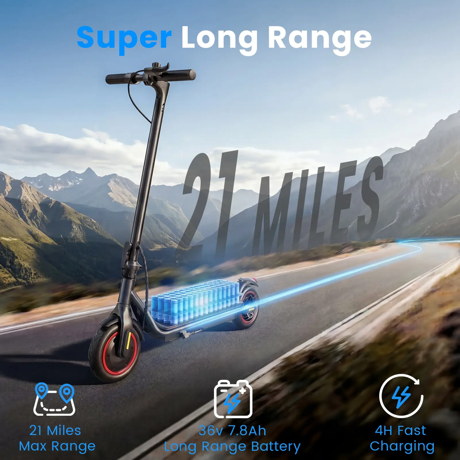 Powered by a high-efficiency battery, this e-scooter offers a travel range of 15–21 miles on a single charge. With 4-hour fast charging, you can quickly get back on the road, making it ideal for city rides and short trips.
