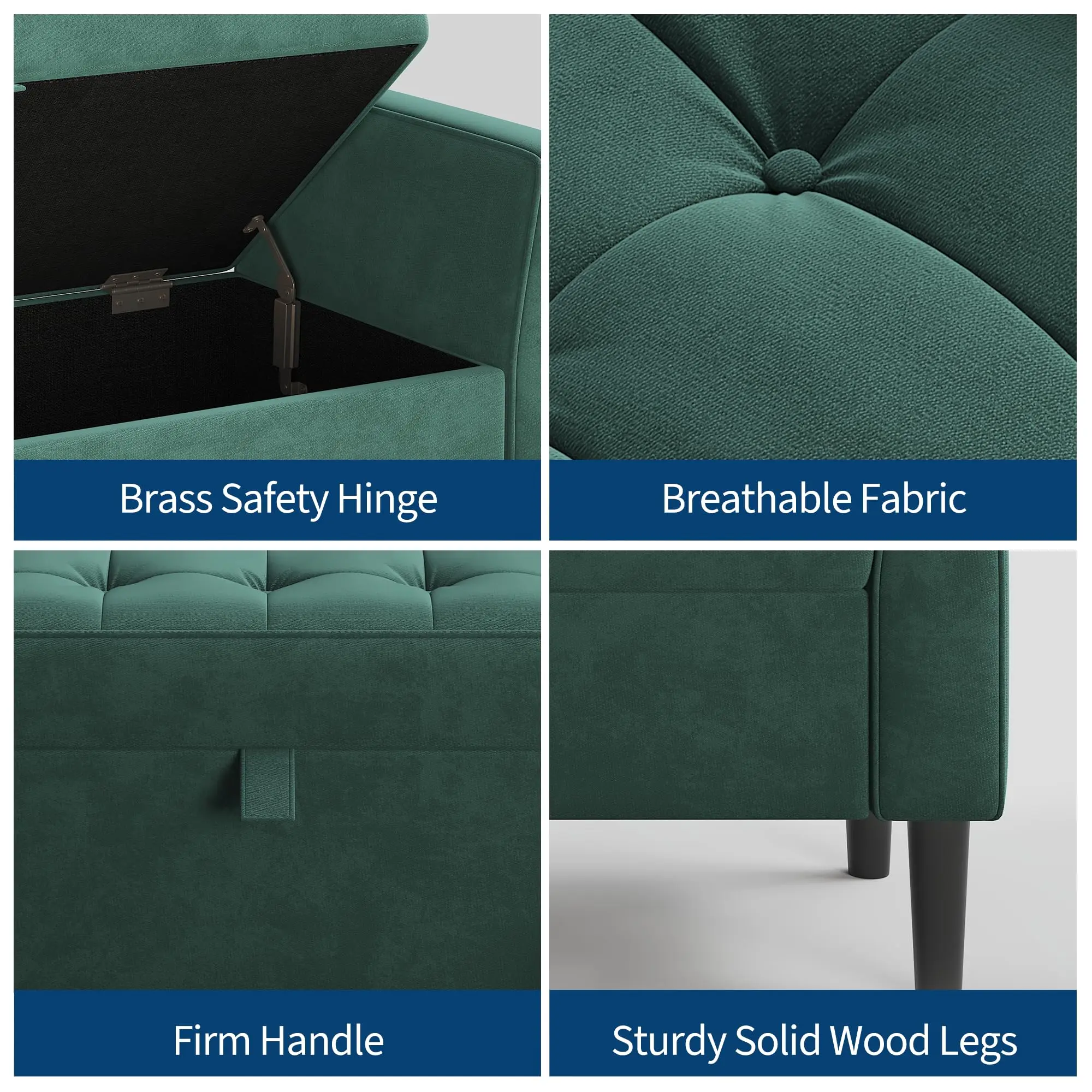 Built with a wooden frame and reinforced with sturdy wood legs, this bench supports up to 350 lbs. The slow‑close safety hinges ensure smooth, secure operation—preventing accidental slams while providing easy access to stored items.