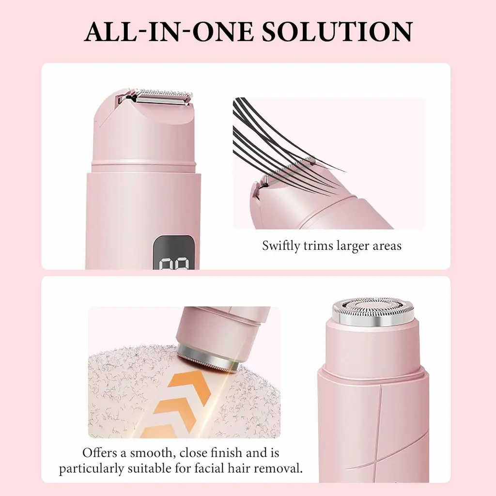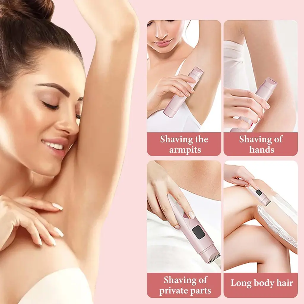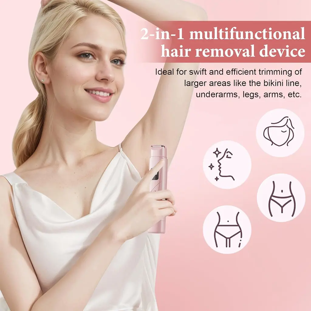This portable 2-in-1 women's hair removal device is designed for easy and gentle trimming on multiple body areas, including the bikini line, underarms, arms, and legs. With dual heads, a built-in rechargeable battery, waterproof design, LED display, low-noise operation, and Type-C charging, it offers convenient grooming at home or while traveling.
