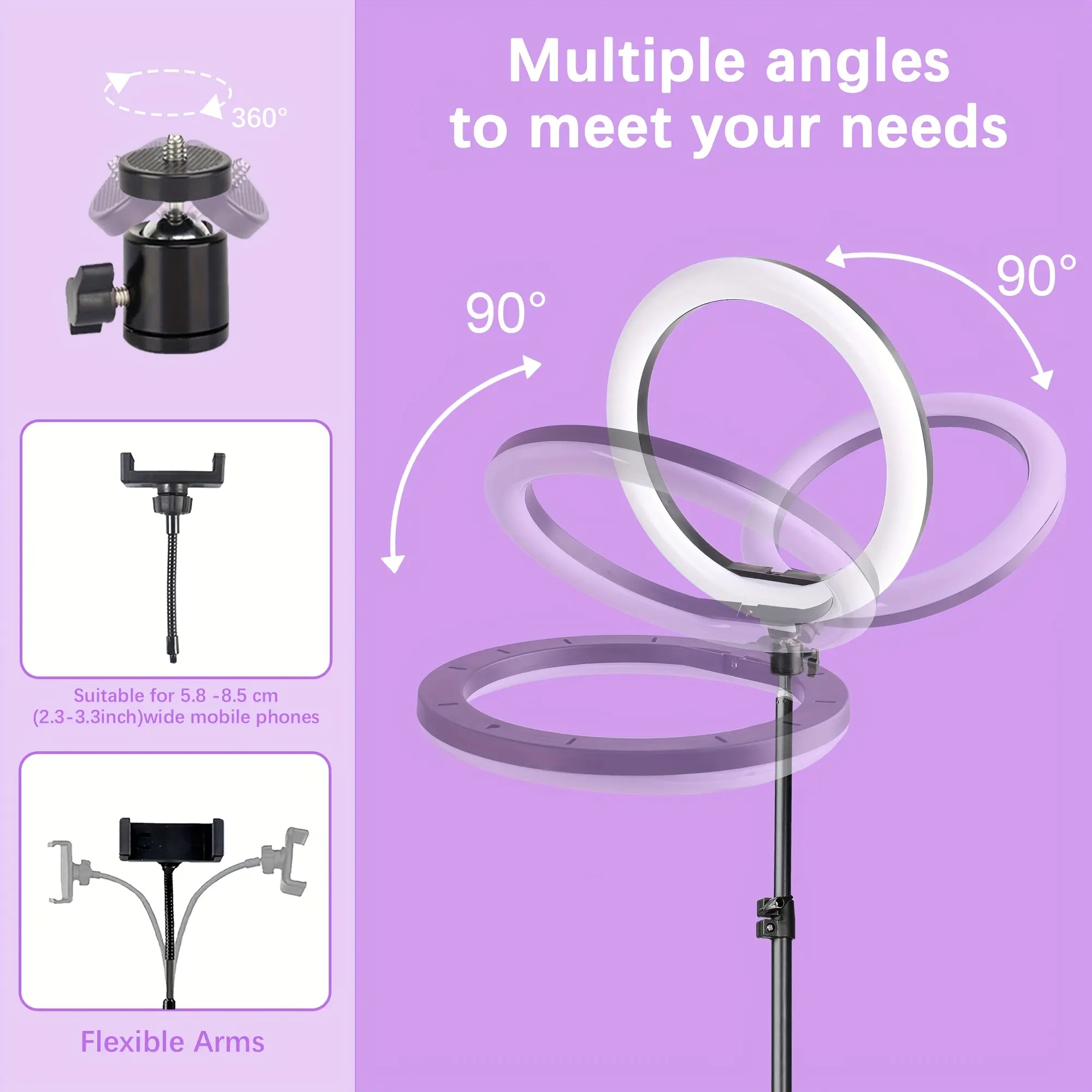 ·Key Perks & Flexibility: Instantly switch color modes and brightness levels for on-the-go control. The compact folding design offers portability, while the 180° adjustable tripod head and 360° rotating phone mount (fits phones up to 7", cases included) enable versatile shooting angles.
