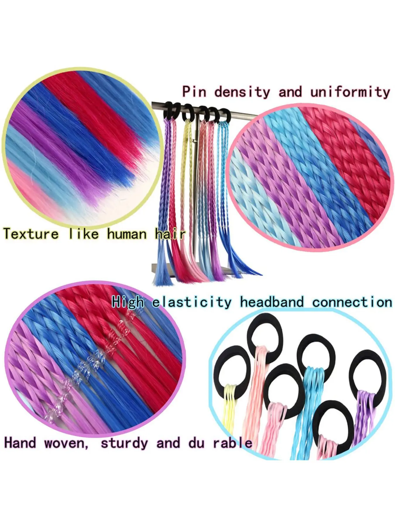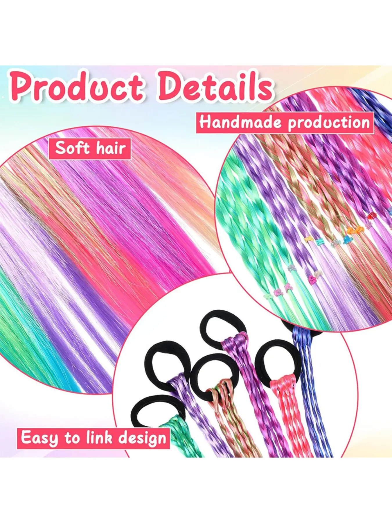 Girls' rainbow braid hair extensions, children's ponytail hair extensions, girls' hair accessories, challenging braid hair extension styles, 6 crazy accessory headbands