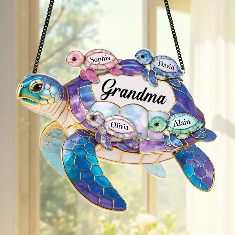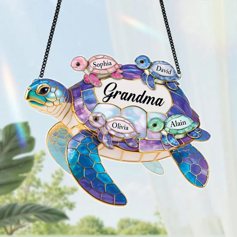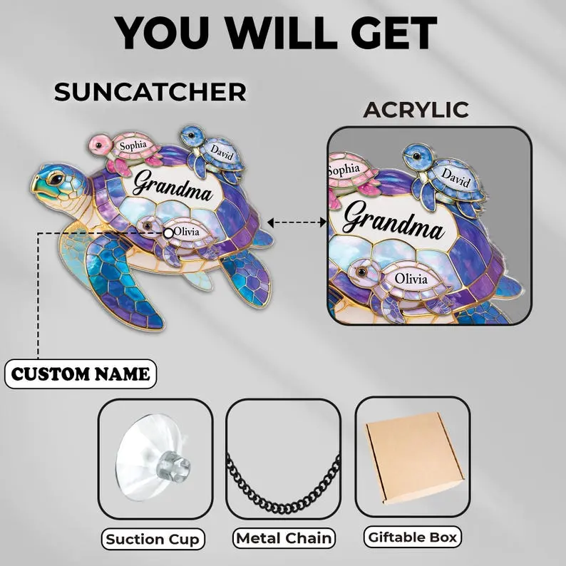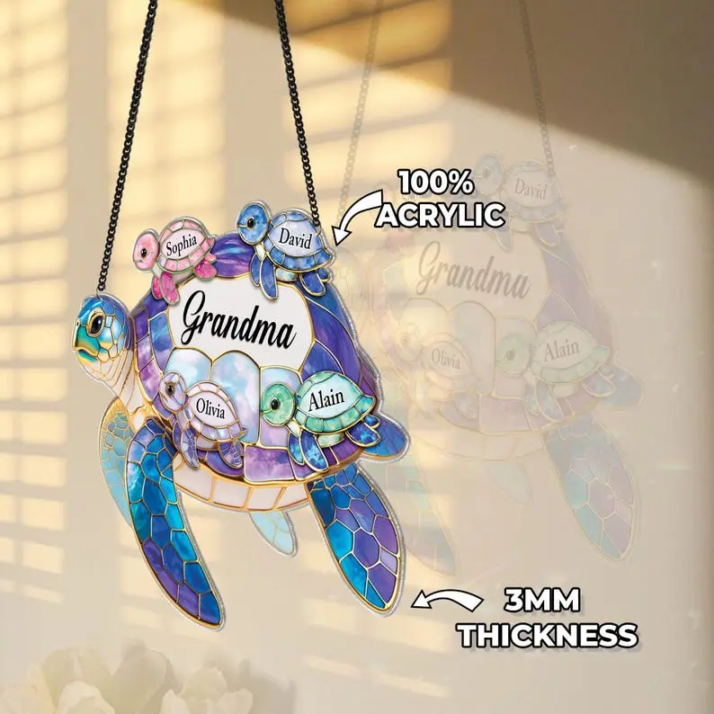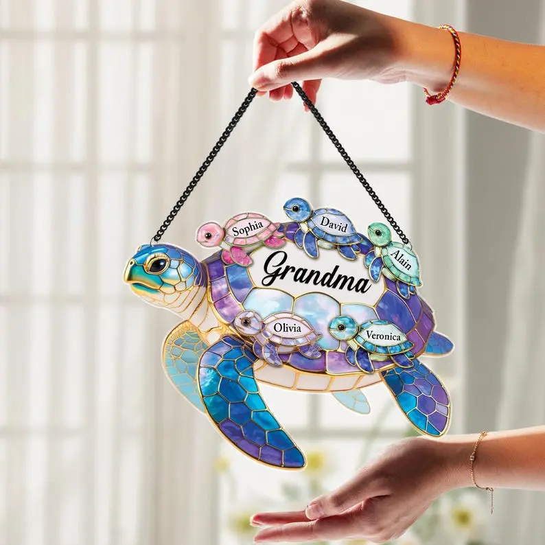 1 Custom Turtle SuncatcherDurable black metal hanging chainSuction cup for easy window displayProtective gift-ready packagingMATERIAL & SIZE:Material: Premium AcrylicAvailable sizes: 4", 6", 8", 10", 11.8"🎯 Who Is This Product For?Grandmothers who adore their grandchildrenFamilies looking to celebrate love and connectionChildren gifting something meaningful to GrandmaPeople who enjoy ocean-themed or artistic décorAnyone seeking a heartfelt, personalized keepsake🏡 Perfect For Decorating / Using In:Window displays with natural sunlightLiving room or family gathering spacesBedroom decorationKitchen windowsReading nooks or cozy cornersCoastal, beach house, or nature-inspired interiors
