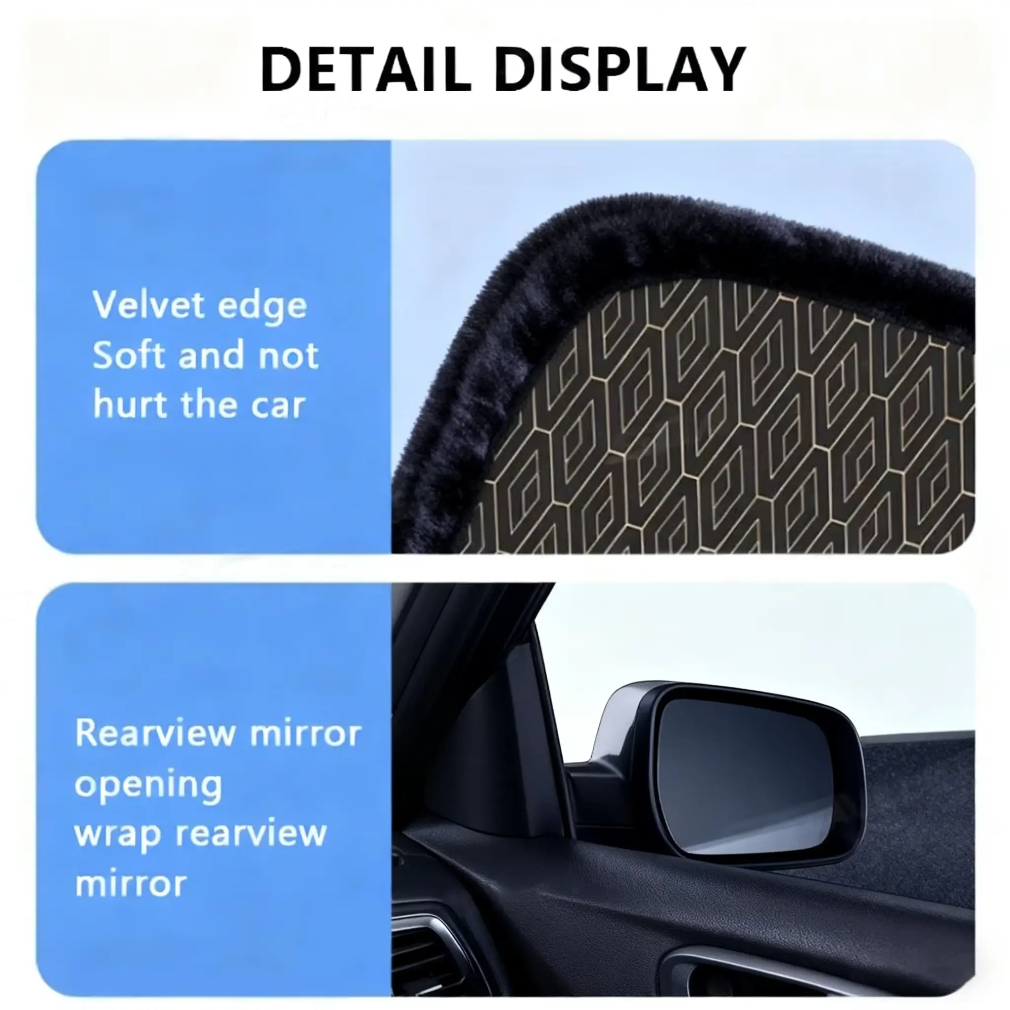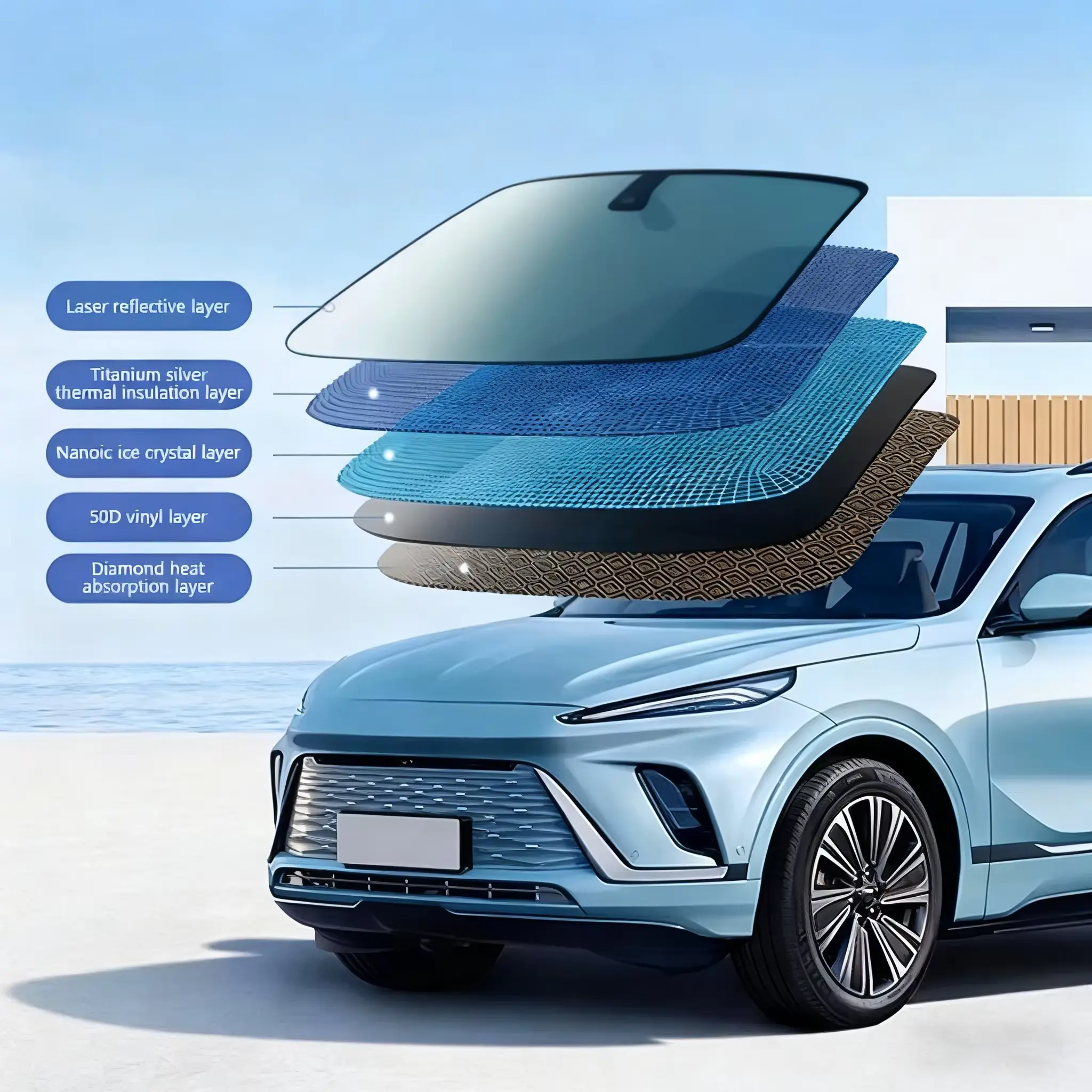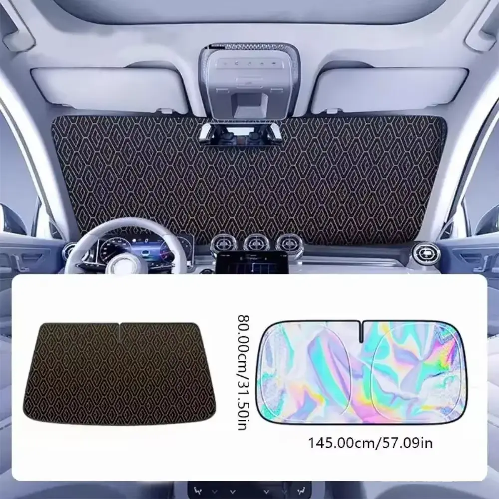 Specification: Name: Car front windshield sunshade Material: Oxford cloth / alloy Installation: Elastic folding, velcro paste Size: 145cm*80cm Function: Sunscreen, heat insulation, UV protection Season: Universally applicable to all seasons Package:1*front sunshade + 1*storage bag Features: 1.5-layer thermal insulation and cooling.Lingge thermal insulation layer, titanium silver ice wire layer, nano ice crystal layer, 50D vinyl layer, laser composite layer. 2.All-band sunscreen≥99.8%,Using the principle of physical materials and reflection, it fully blocks the intrusion of ultraviolet rays, and the temperature drops by 16°. 3.High elastic steel skeleton, durable and not deformed. Memory metal skeleton for easy storage. 4.Interior protective cover, good cars are better to do sun protection. Effectively isolate high temperatures and solve the problem of interior aging caused by light. 5.Small Space Occupation: The solid foldable structure allows quick collapsing into a compact size, optimizing storage space in car compartments or trunks. Installation: 1. Lay the four corners of the visor on the front windshield. 2. It can be pressed with the sun visor of the original car.