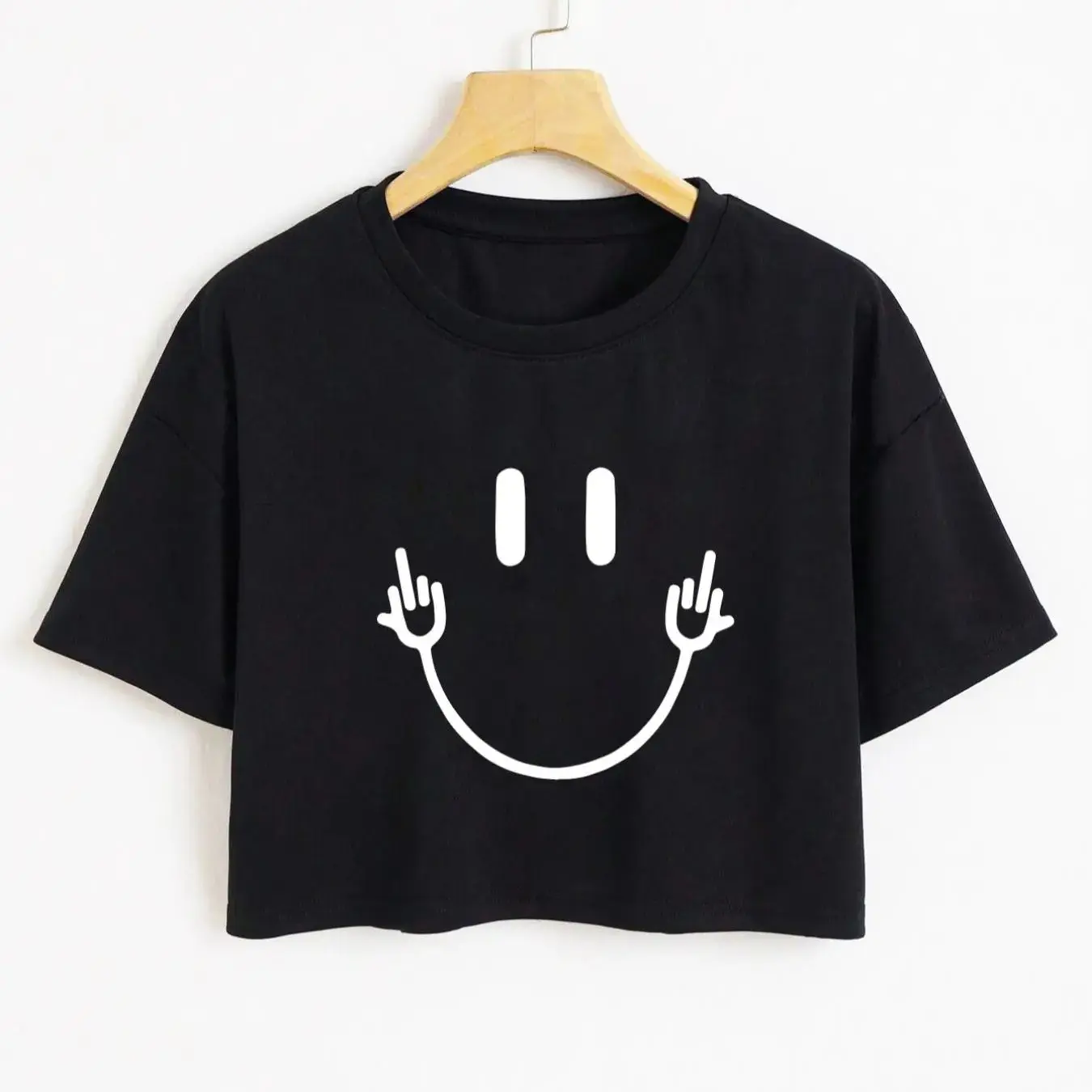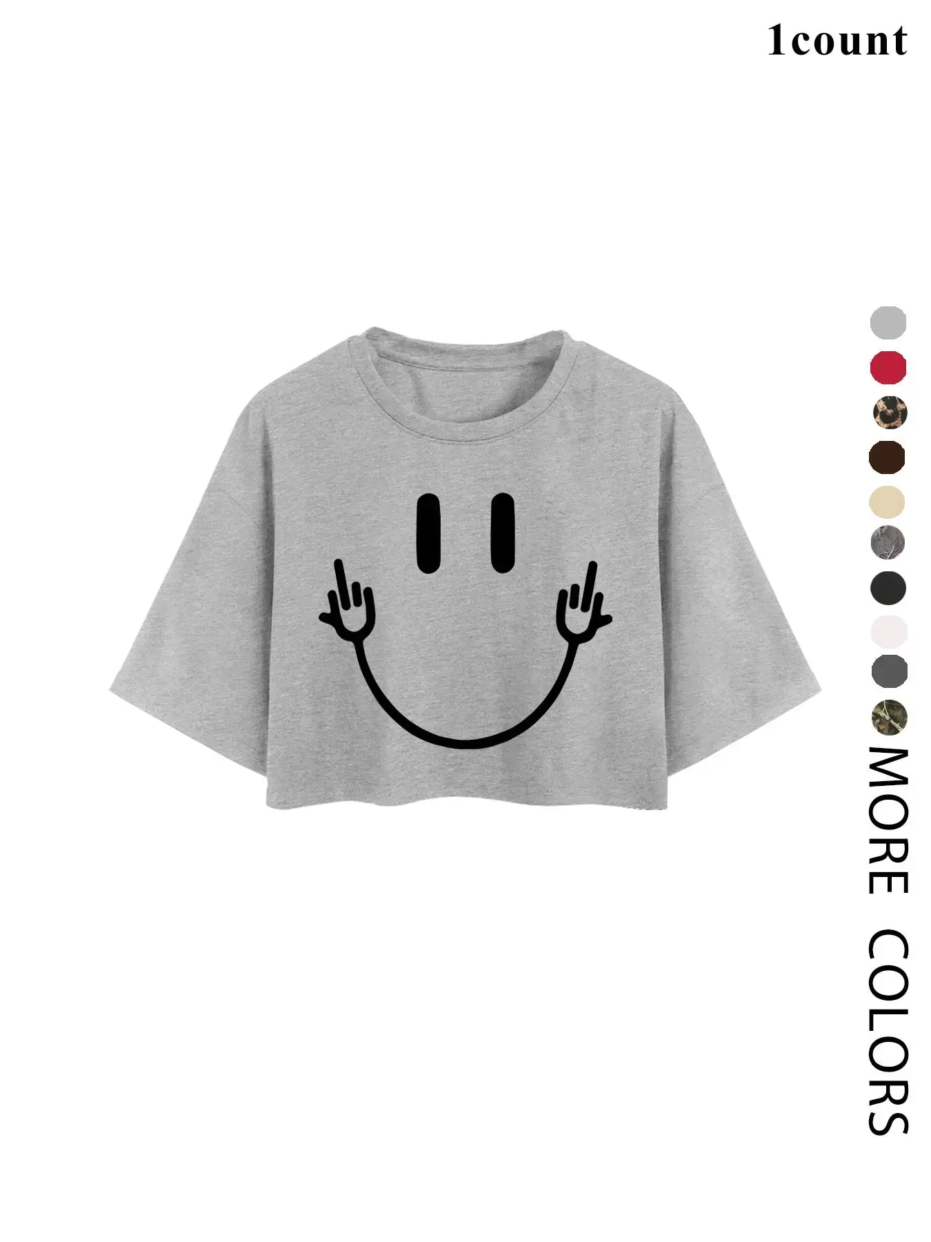 Women's Cartoon Face Print Round Neck Stretchy Crop Tee, Fashion Chic Casual Drop Shoulder Short Sleeve Top T-Shirt for Daily Outdoor Wear, Ladies Clothes for All Seasons