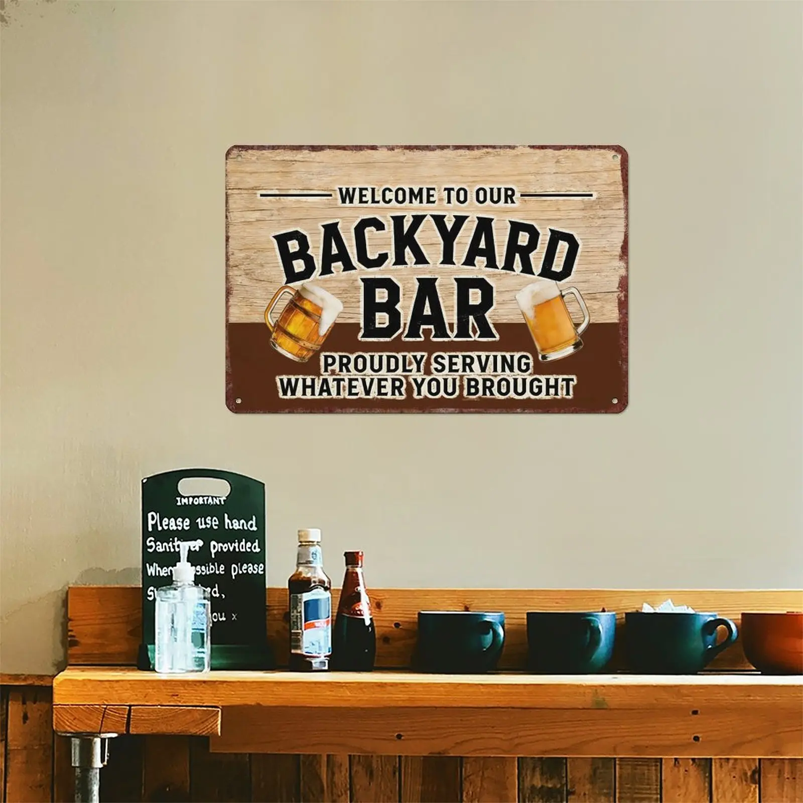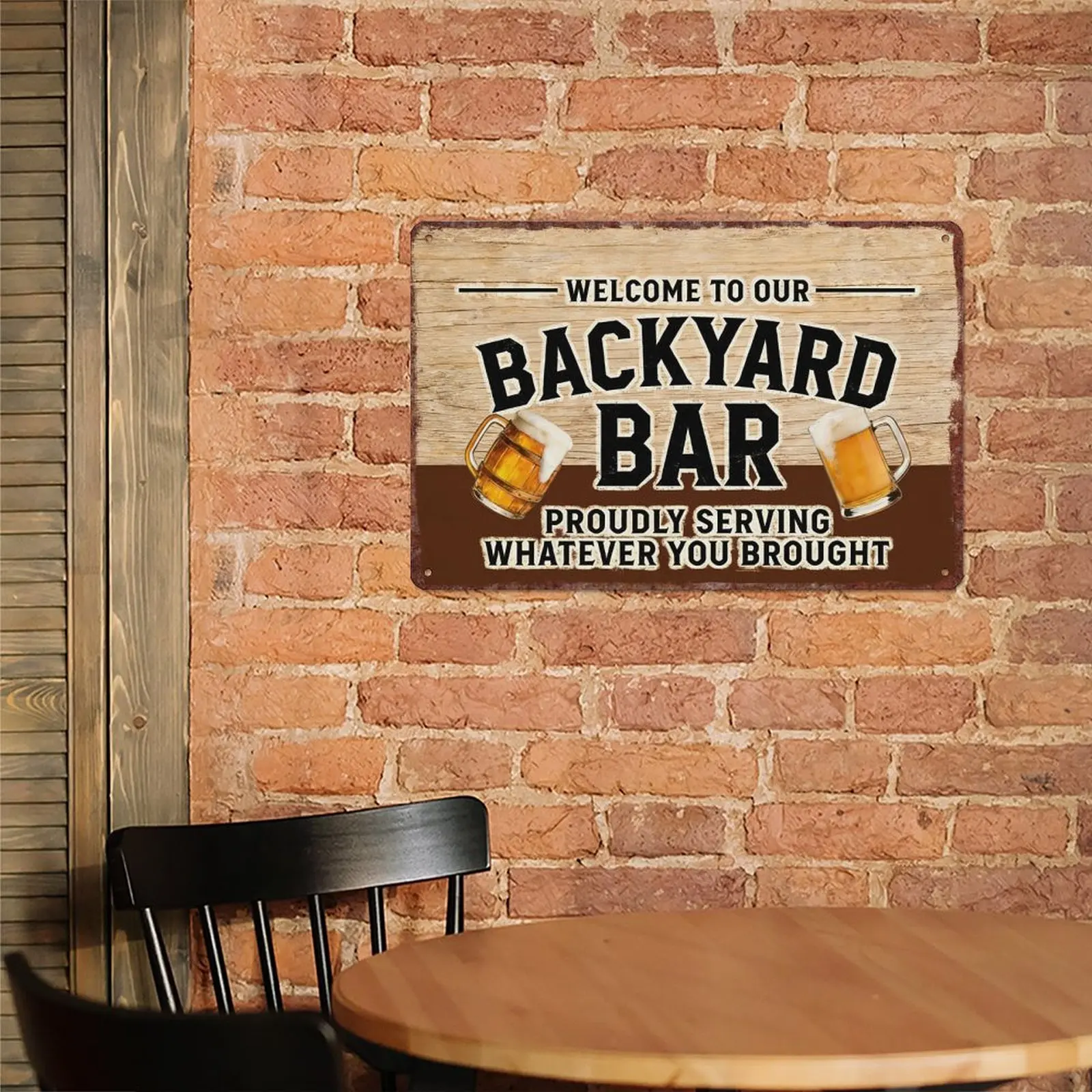 This sign is perfect for adding a touch of humor and charm to your outdoor spaces. Ideal for backyards, pools, patios, bars, and pubs. It proudly declares, "Proudly Serving Whatever You Brought," making it a fun addition to any setting. The vintage design complements various decor styles.