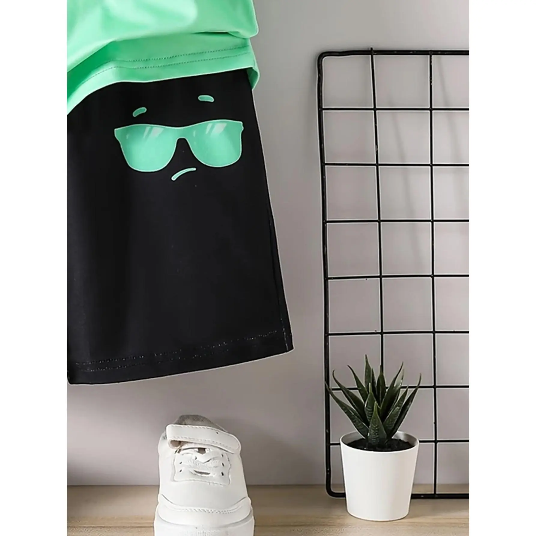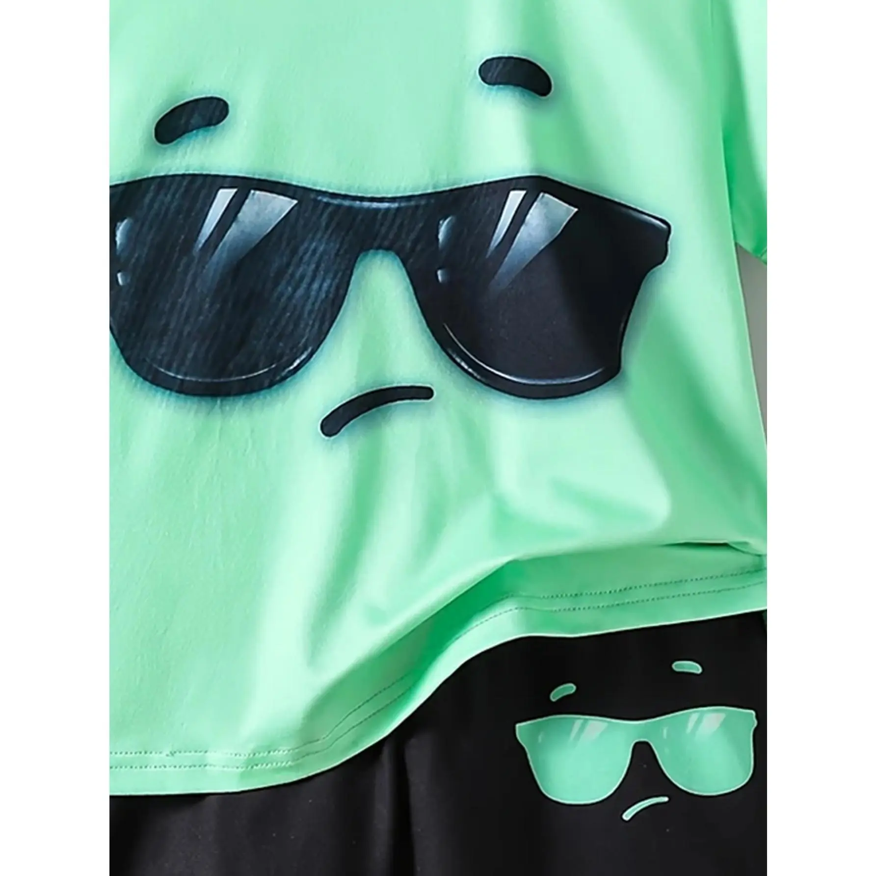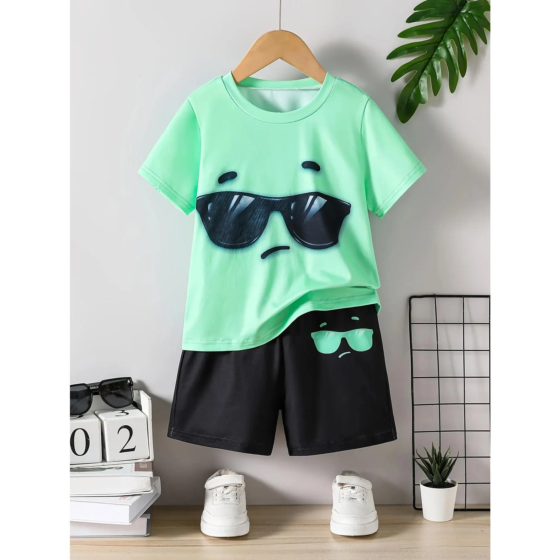 Boys' Summer Short Sleeve and Shorts Set with Cool Glasses Print, Featuring a Casual Short Sleeve Top and Shorts, Suitable for Spring and Summer School and Parties, Perfect for Outdoor