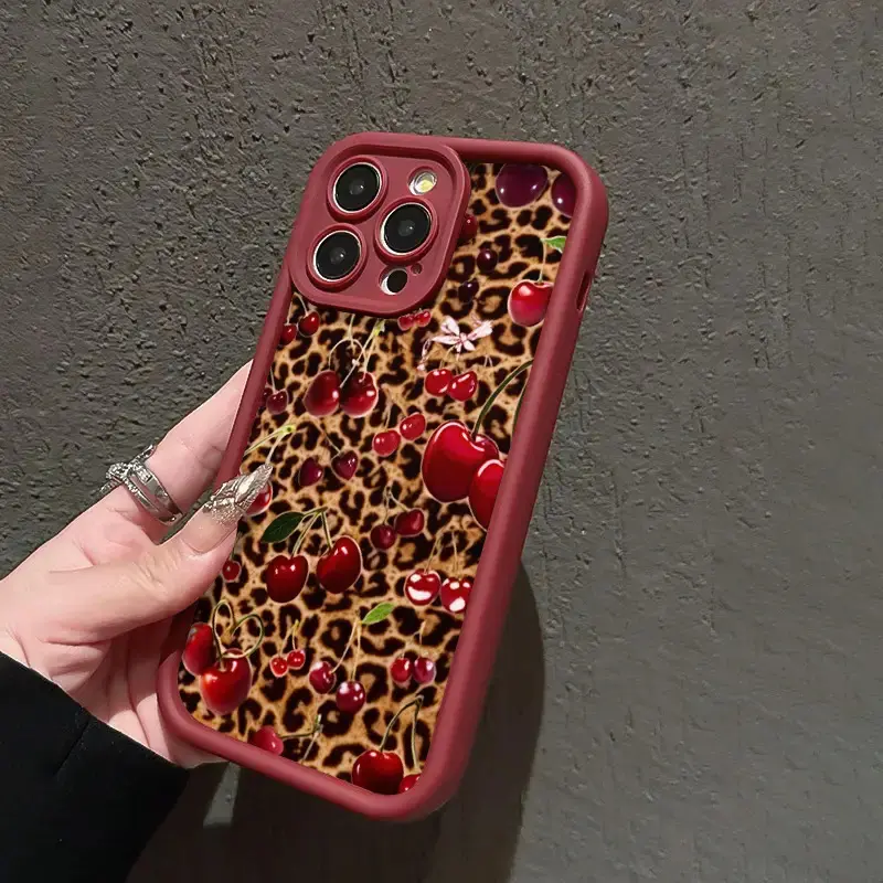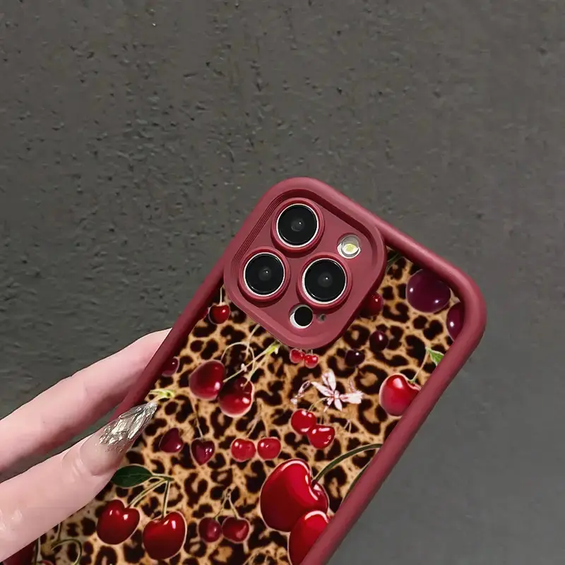High Bamboo Wine Red Leopard and Cherry Pattern Sweet and Spicy Shockproof TPU Case for iPhone 17 Pro Max 16 16e 15 14 Plus 13 12 Mini 11 Air X XS Straight Edge Drop-Resistant Rugged Durable Cover Shell Gift 2D printing