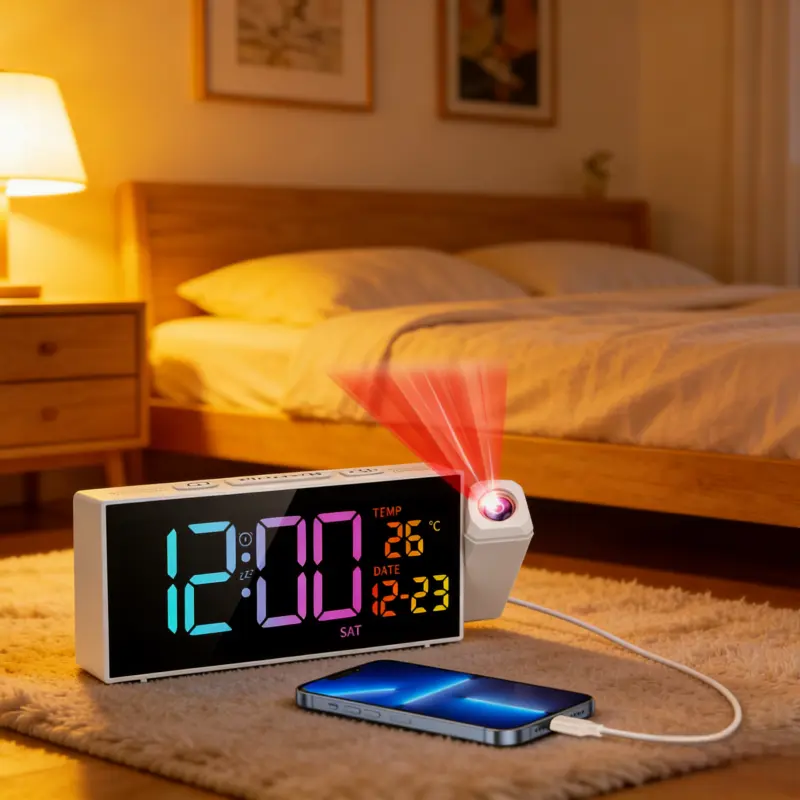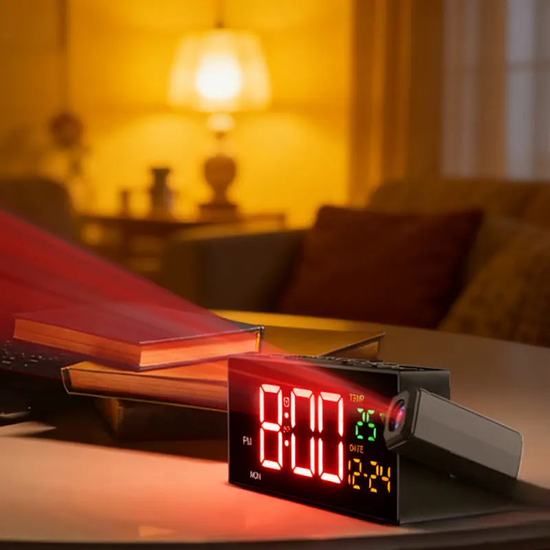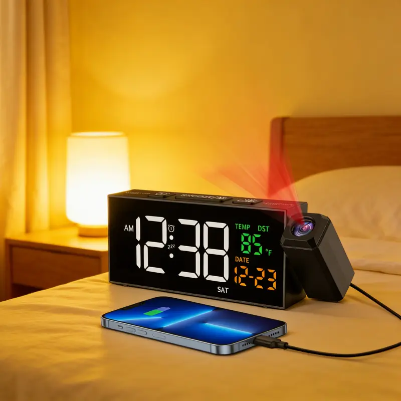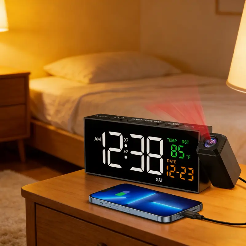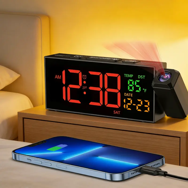 Projection Alarm Clock - Projects the time onto your wall or ceiling, so you can conveniently check the time anytime in your bedroom. With a sharp projection range of 1.6–11.4 feet and a 350° rotating arm for ideal placement, the time remains clearly visible at all times.