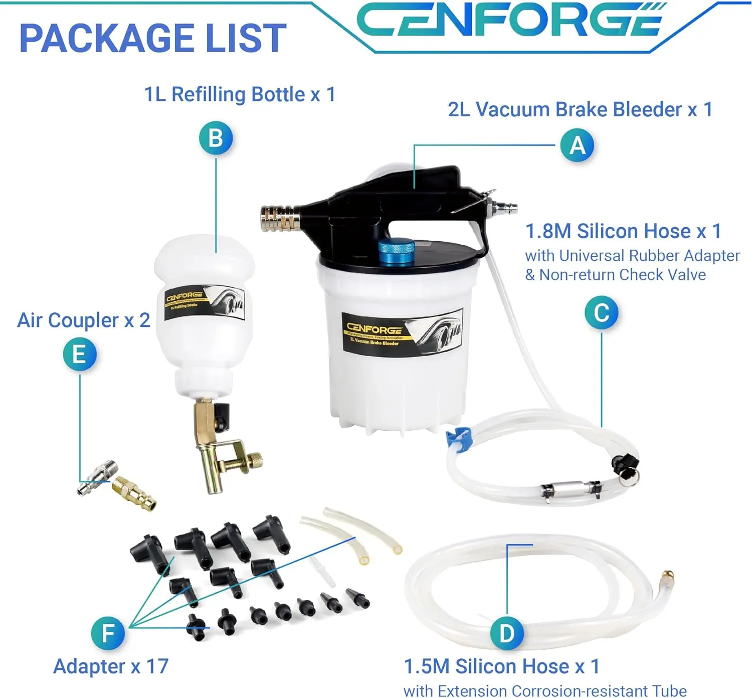 ·[Universal Design] Our Vacuum Brake Bleeder Kit includes 2L Brake Fluid Extractor, 1L Refilling Bottle, Adapters, American and European Air Intake, Designed for most standard and ABS brake systems on car, motorcycle, truck, and ATV.