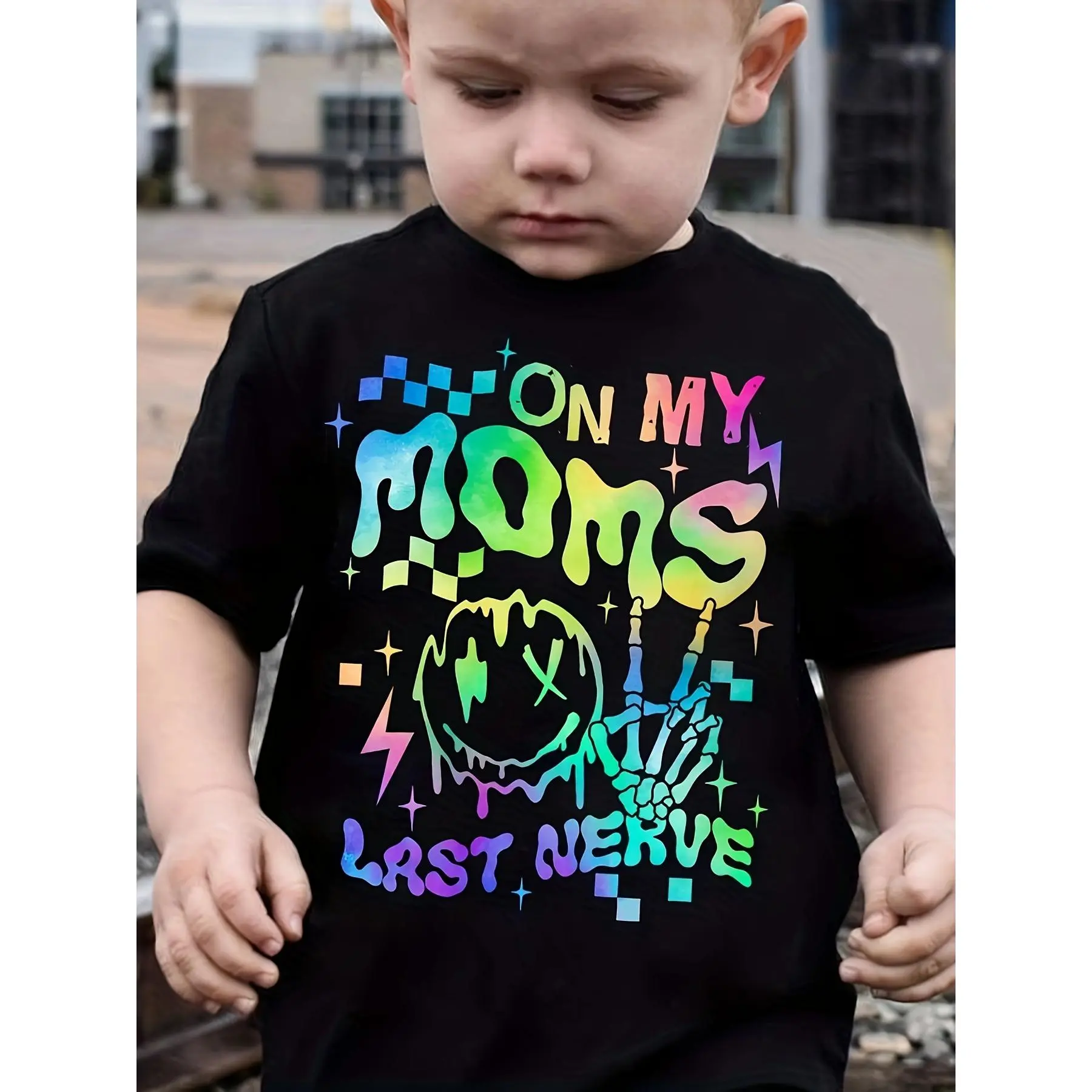 On My Mom's Last Nerve Print Boy's Short Sleeve T-shirt, Funny Comfortable Crew Neck Summer Top, Boys Clothing As Gifts ,Children's Outdoor Sports T-shirt