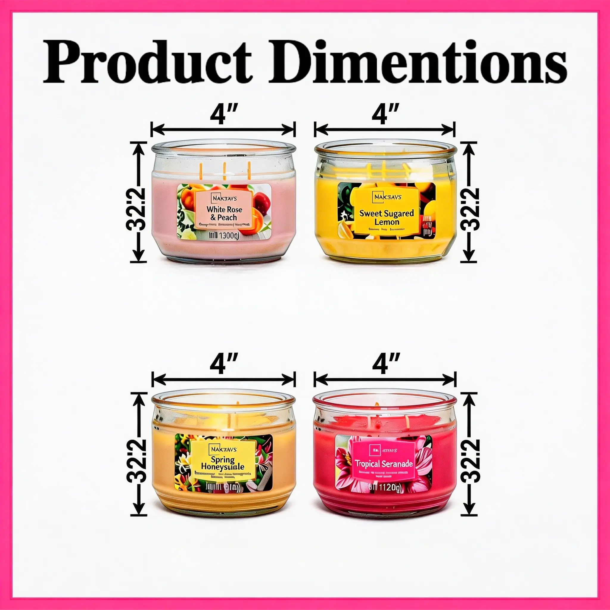 4 PREMIUM 3-WICK CANDLES: Rose Peach, Lemon, Honeysuckle, Tropical — scents for every mood!
