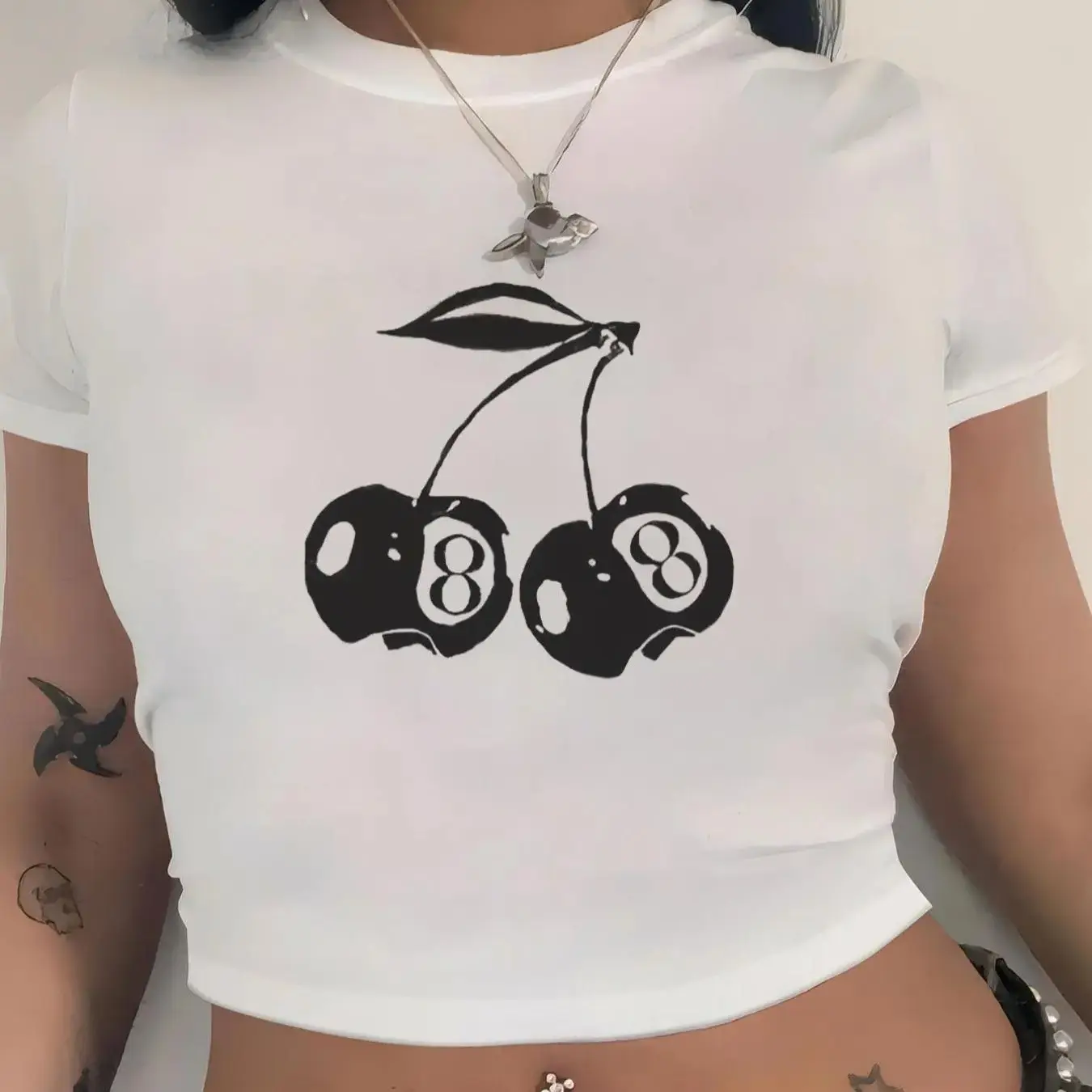 Women's Cherry & Number Print Crop Tee, Casual Slim-fitting Short Sleeve T-shirt, Ladies Summer Clothes for Daily Wear, Top